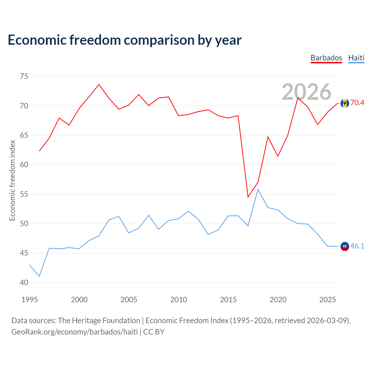 The Economic Freedom Index for Barbados is 70.4, ranking 34/197, compared to 46.1 for Haiti, ranking 178/197. The chart above displays a comparison of annual changes in economic freedom indexes.