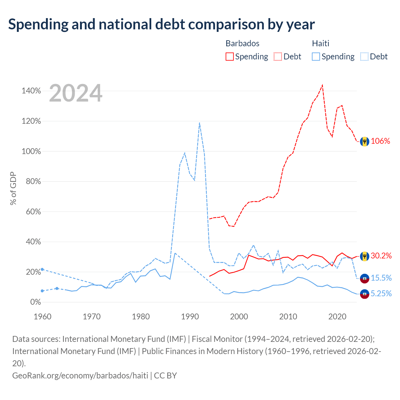 Barbados has $7.97B in government debt (106.3% of GDP), compared to $3.91B (15.5% of GDP) in Haiti.