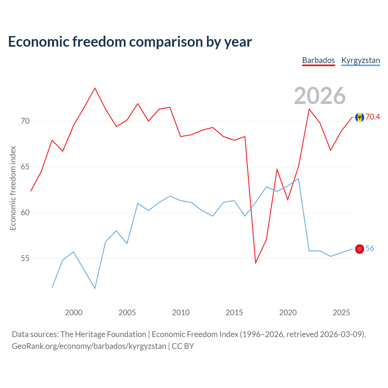 The Economic Freedom Index for Barbados is 70.4, ranking 34/197, compared to 56 for Kyrgyzstan, ranking 126/197. The chart above displays a comparison of annual changes in economic freedom indexes.