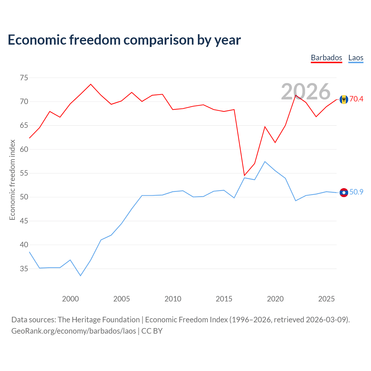 The Economic Freedom Index for Barbados is 70.4, ranking 34/197, compared to 50.9 for Laos, ranking 157/197. The chart above displays a comparison of annual changes in economic freedom indexes.
