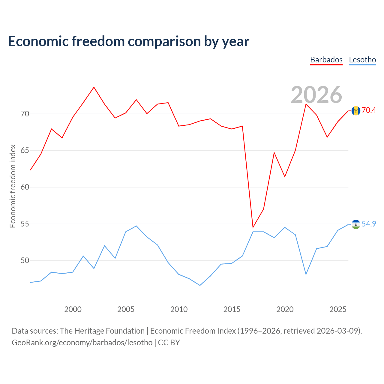 The Economic Freedom Index for Barbados is 70.4, ranking 34/197, compared to 54.9 for Lesotho, ranking 130/197. The chart above displays a comparison of annual changes in economic freedom indexes.
