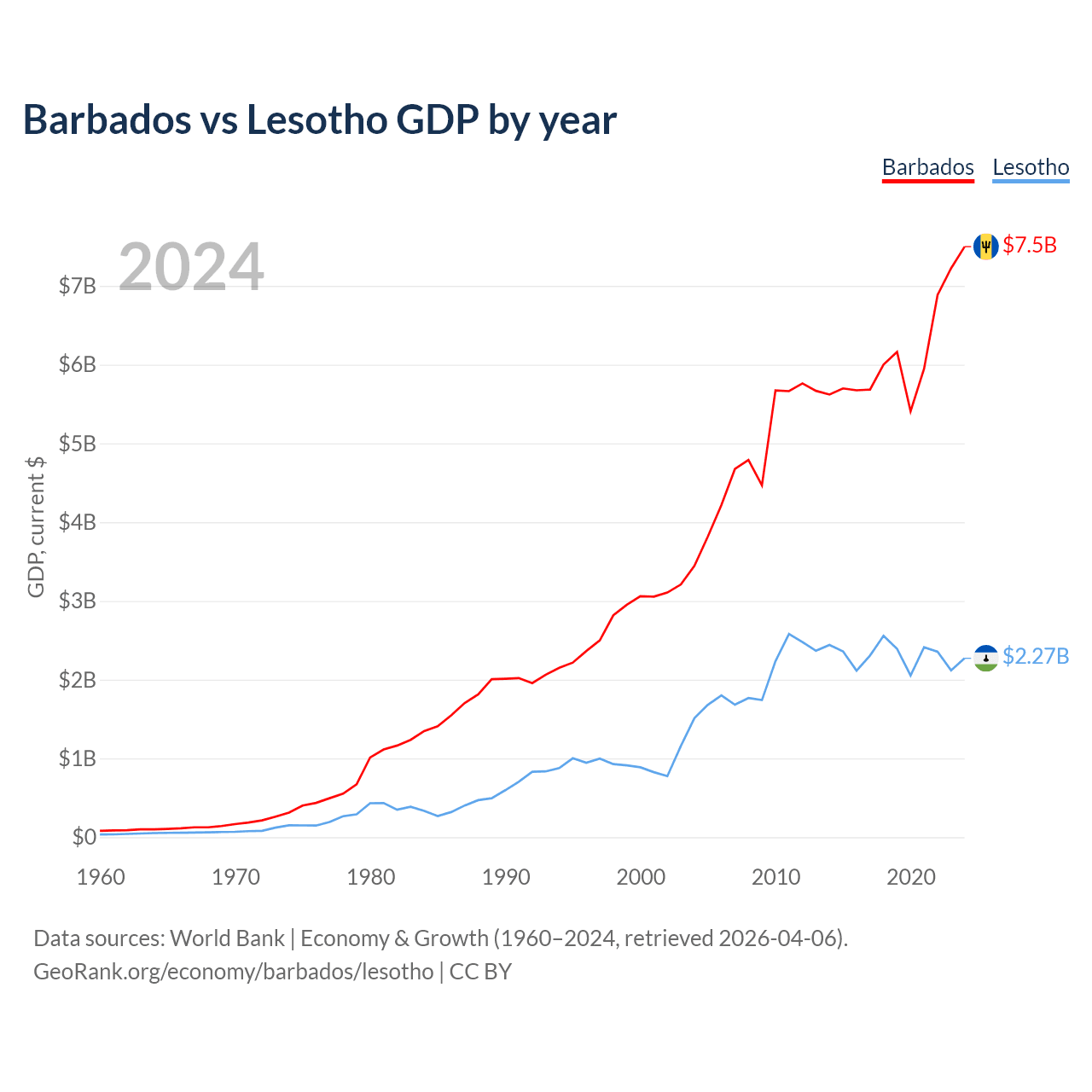 Barbados has a GDP of $7.5B compared to $2.27B for Lesotho, ranking 157/197 and 175/197 by economy size, respectively.