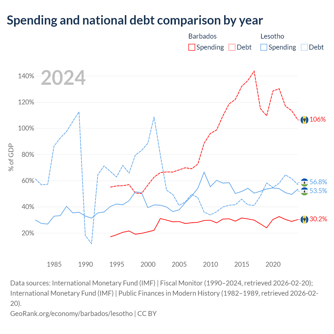 Barbados has $7.97B in government debt (106.3% of GDP), compared to $1.29B (56.8% of GDP) in Lesotho.