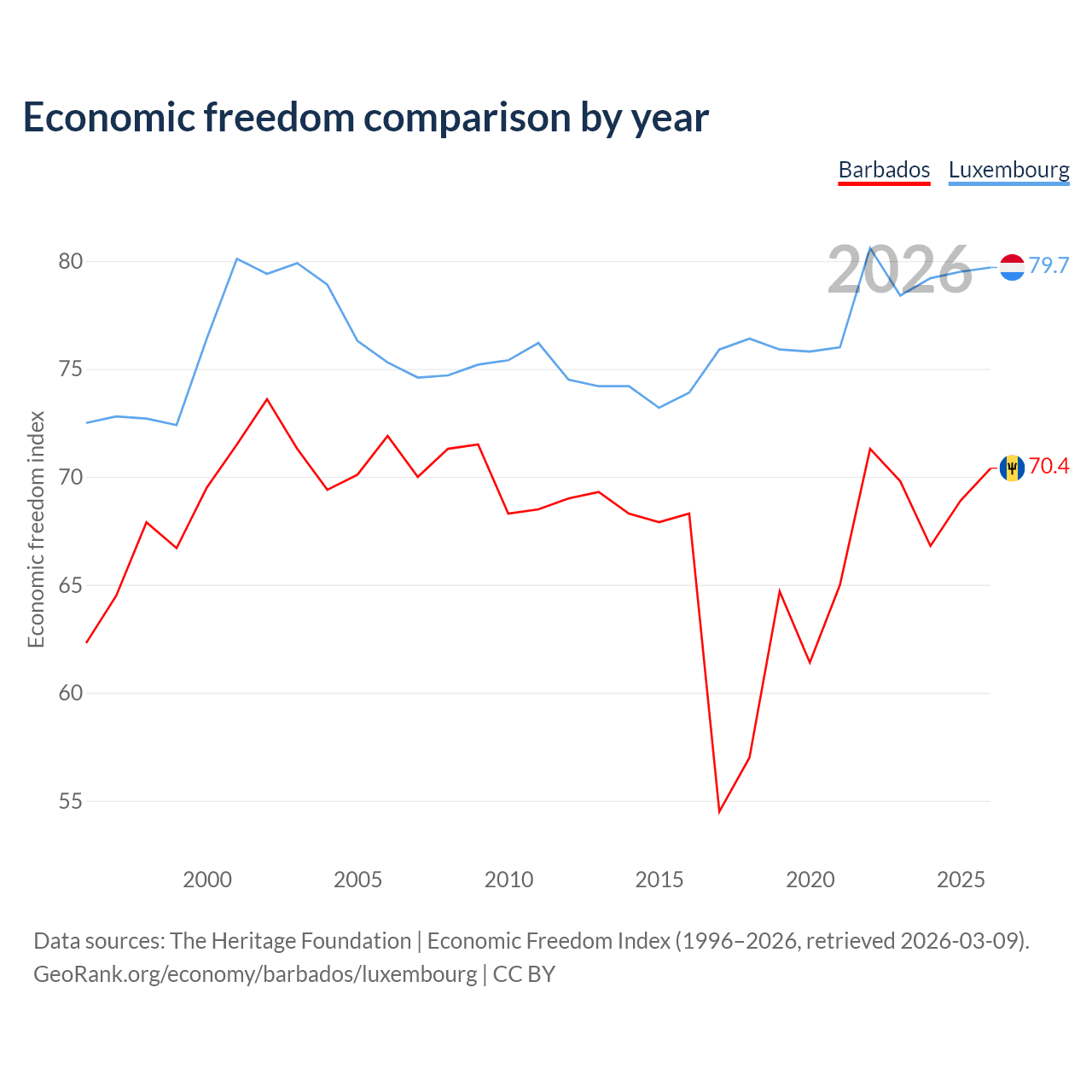 The Economic Freedom Index for Barbados is 70.4, ranking 34/197, compared to 79.7 for Luxembourg, ranking 7/197. The chart above displays a comparison of annual changes in economic freedom indexes.