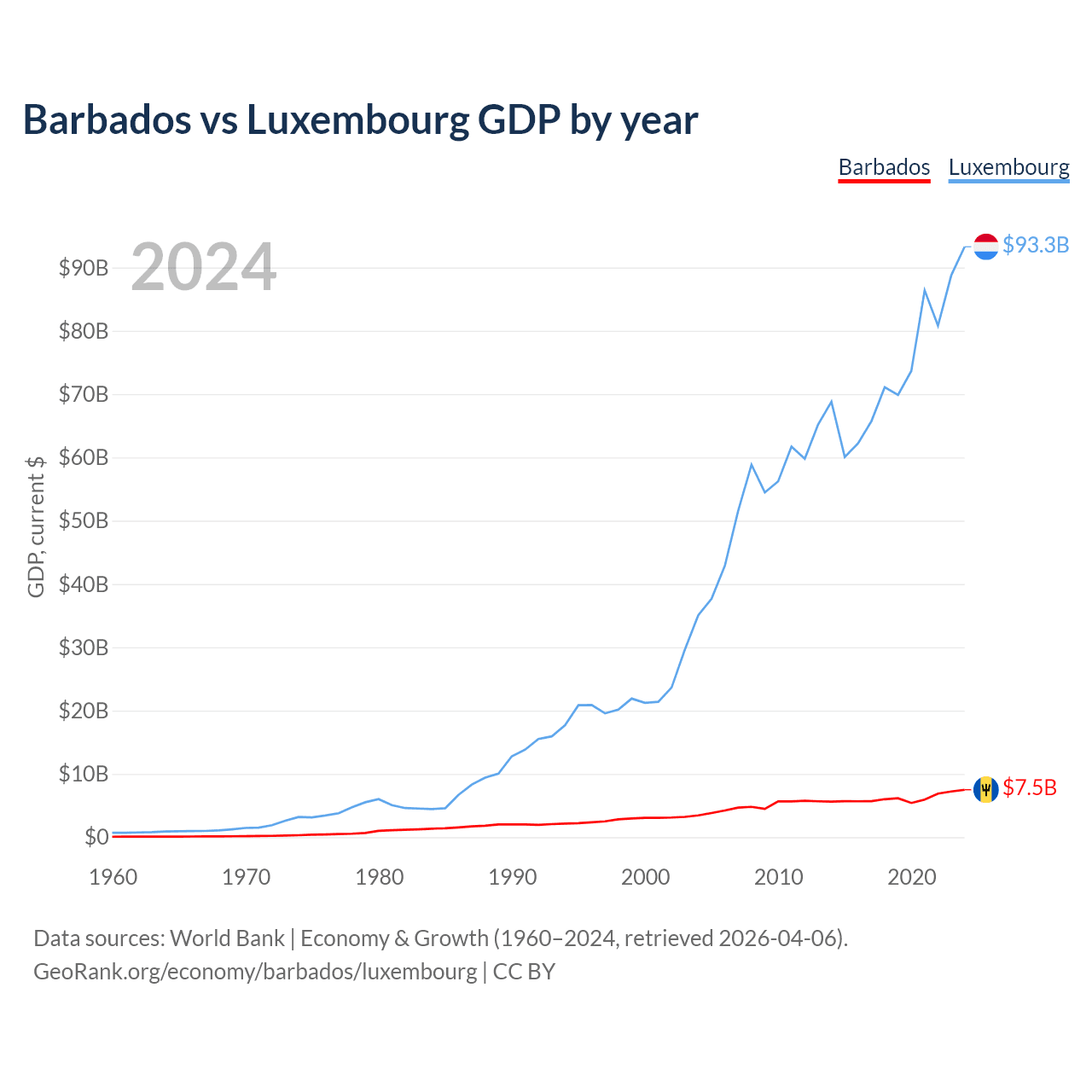 Barbados has a GDP of $7.5B compared to $93.3B for Luxembourg, ranking 157/197 and 74/197 by economy size, respectively.
