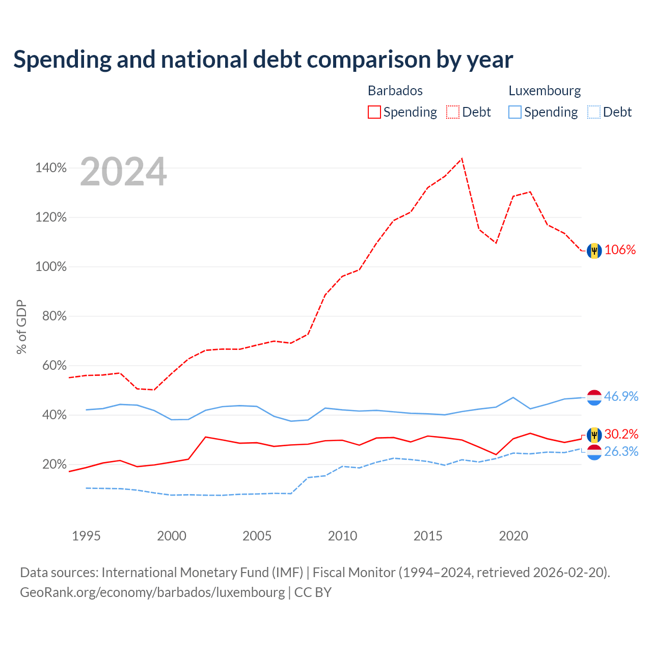 Barbados has $7.97B in government debt (106.3% of GDP), compared to $24.5B (26.3% of GDP) in Luxembourg.