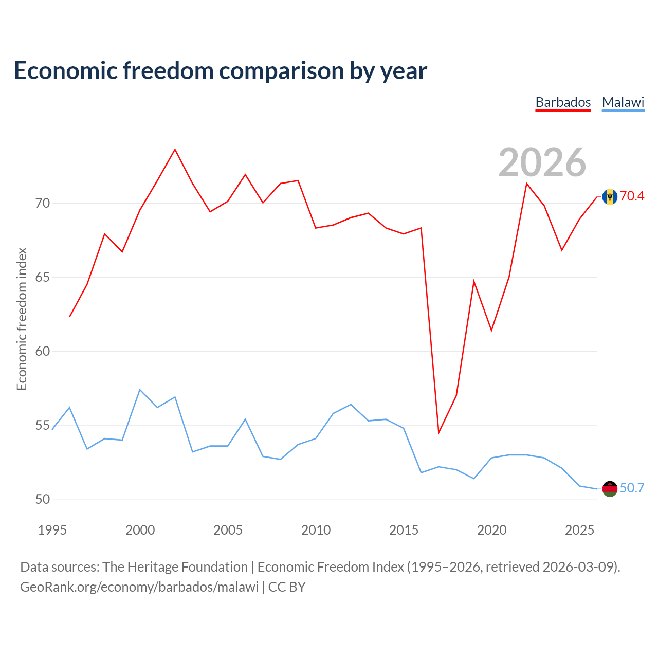 The Economic Freedom Index for Barbados is 70.4, ranking 34/197, compared to 50.7 for Malawi, ranking 159/197. The chart above displays a comparison of annual changes in economic freedom indexes.