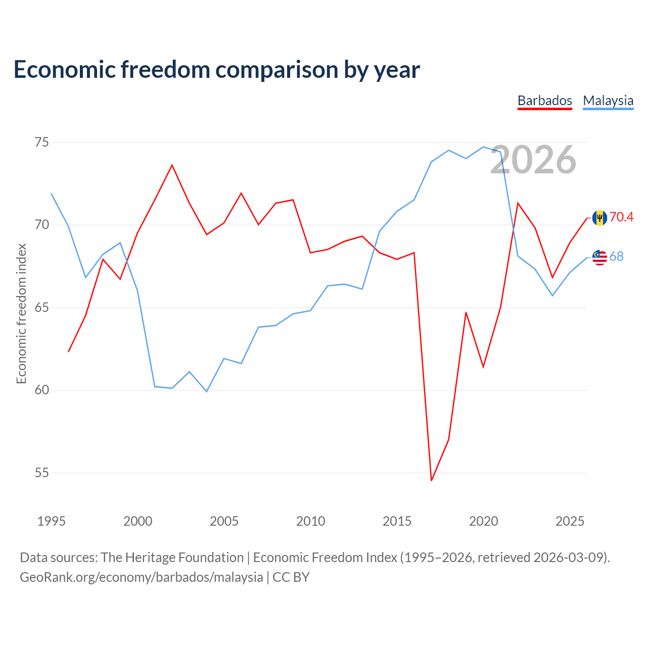 The Economic Freedom Index for Barbados is 70.4, ranking 34/197, compared to 68 for Malaysia, ranking 51/197. The chart above displays a comparison of annual changes in economic freedom indexes.