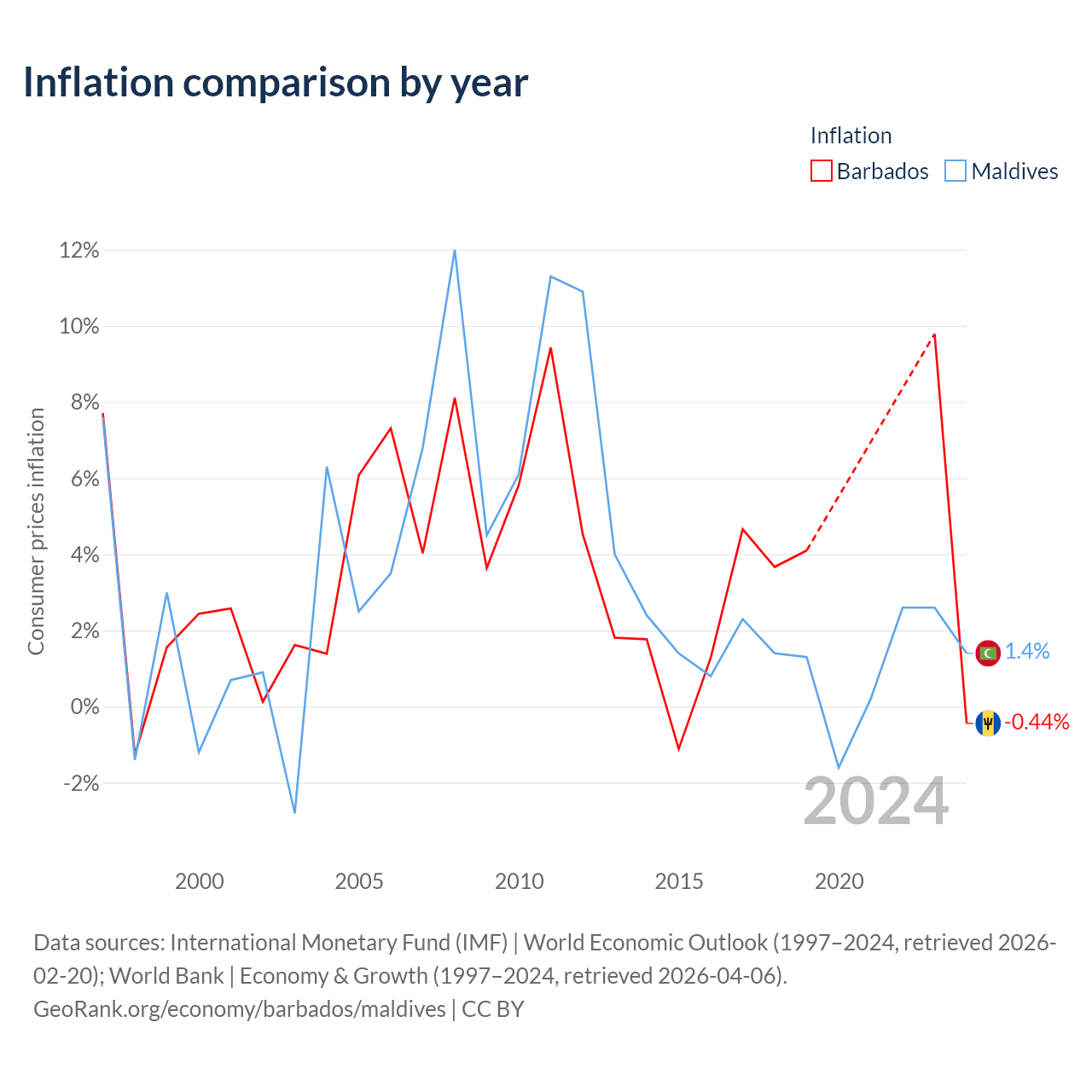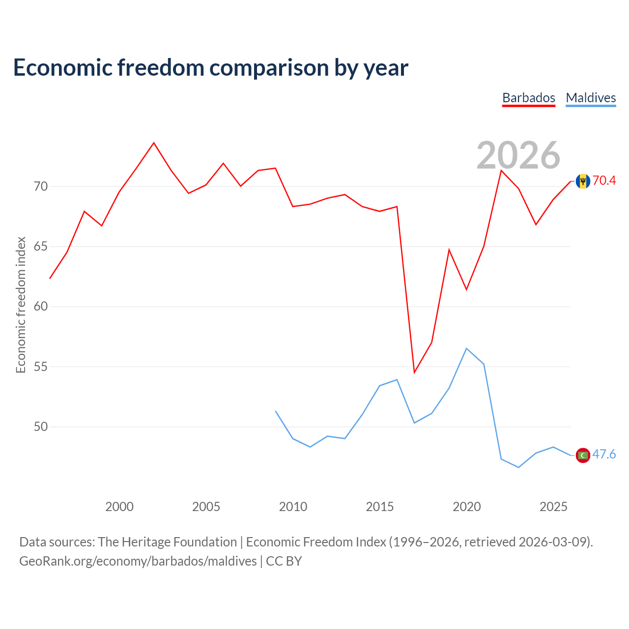 The Economic Freedom Index for Barbados is 70.4, ranking 34/197, compared to 47.6 for Maldives, ranking 174/197. The chart above displays a comparison of annual changes in economic freedom indexes.
