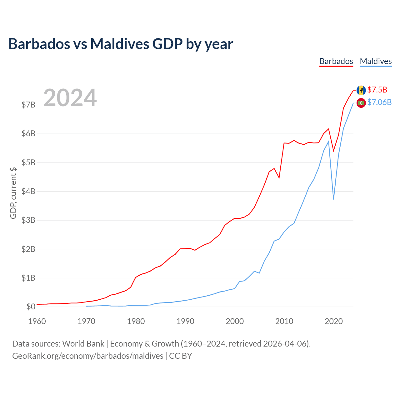 Barbados has a GDP of $7.5B compared to $7.06B for Maldives, ranking 157/197 and 159/197 by economy size, respectively.