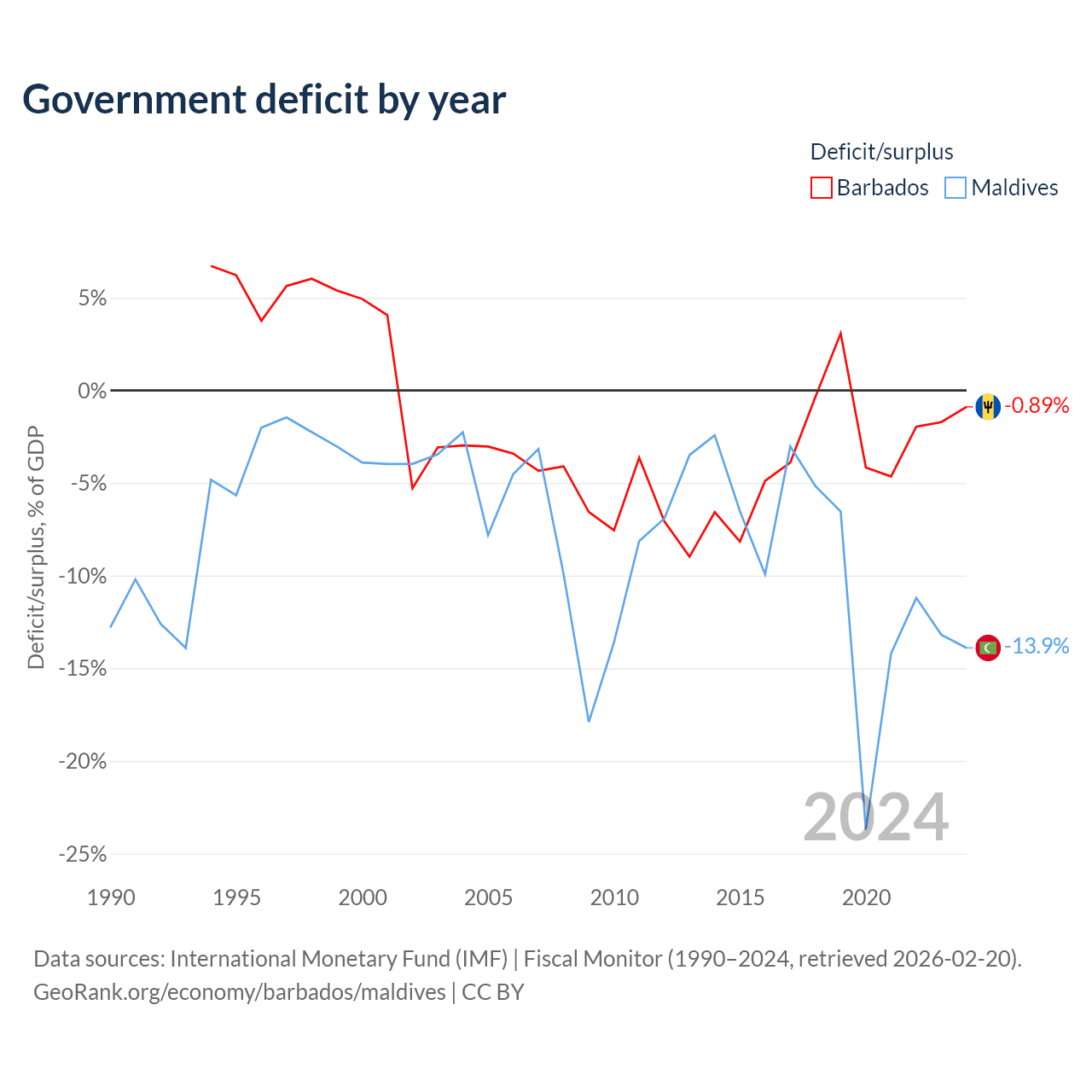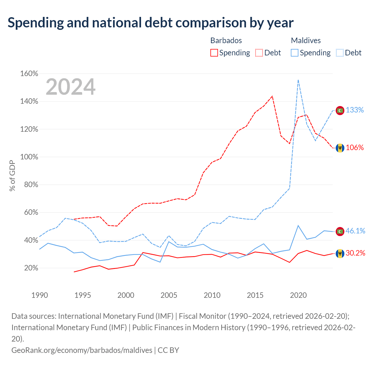 Barbados has $7.97B in government debt (106.3% of GDP), compared to $9.41B (133.3% of GDP) in Maldives.