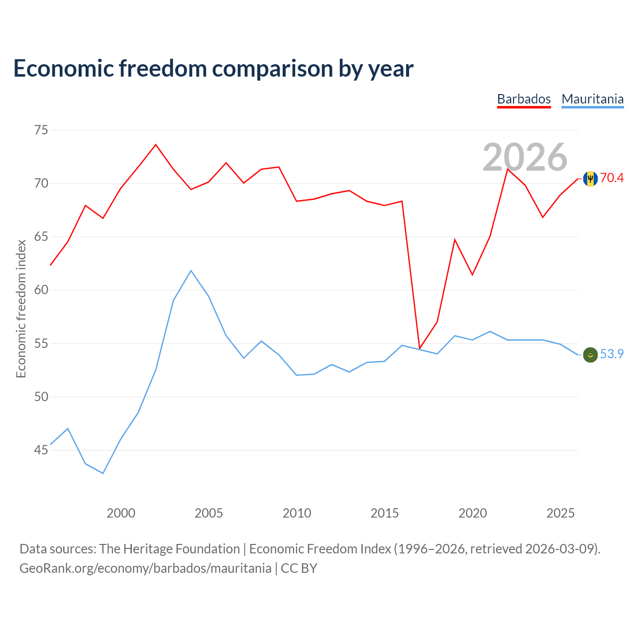 The Economic Freedom Index for Barbados is 70.4, ranking 34/197, compared to 53.9 for Mauritania, ranking 136/197. The chart above displays a comparison of annual changes in economic freedom indexes.