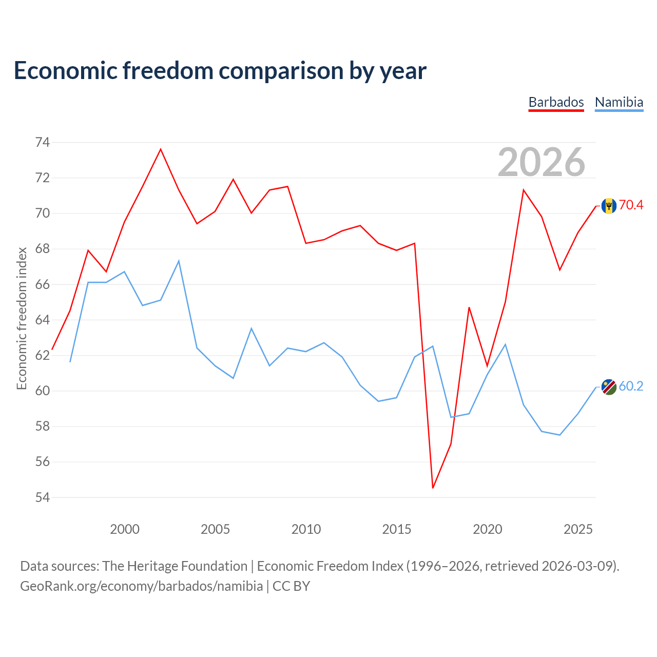The Economic Freedom Index for Barbados is 70.4, ranking 34/197, compared to 60.2 for Namibia, ranking 95/197. The chart above displays a comparison of annual changes in economic freedom indexes.