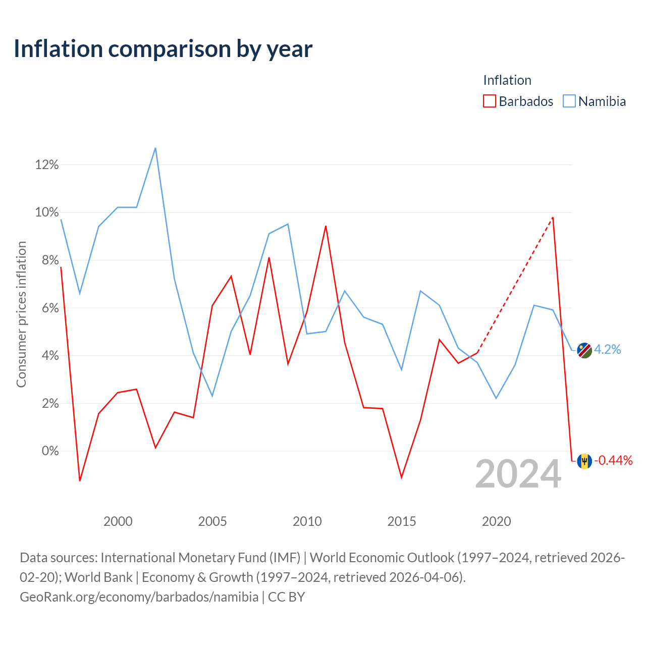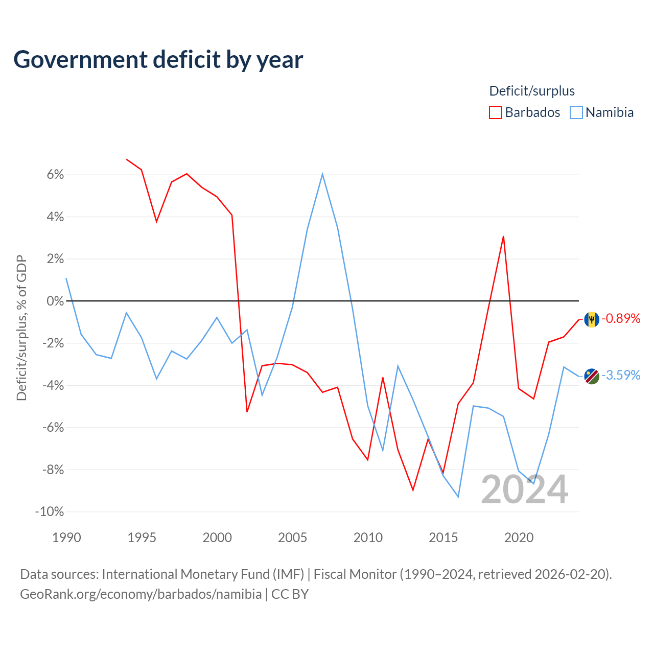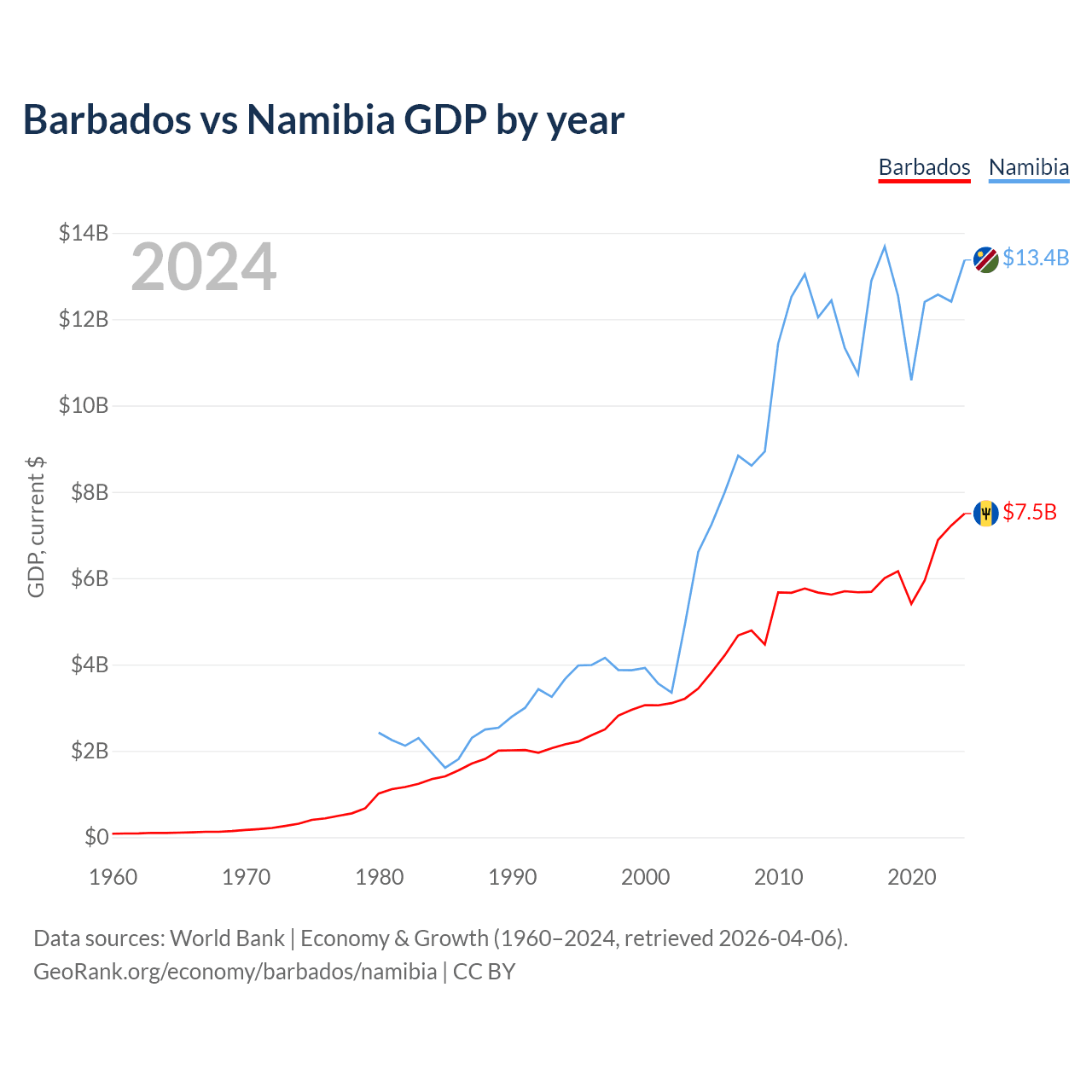 Barbados has a GDP of $7.5B compared to $13.4B for Namibia, ranking 157/197 and 147/197 by economy size, respectively.