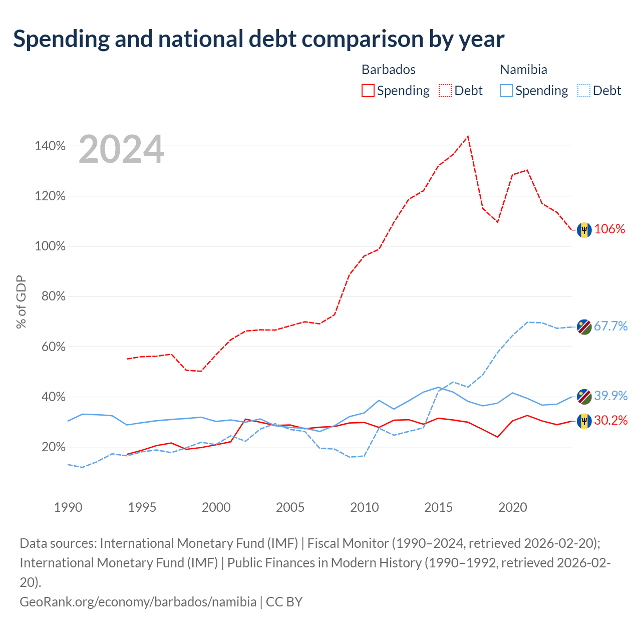 Barbados has $7.97B in government debt (106.3% of GDP), compared to $9.05B (67.7% of GDP) in Namibia.