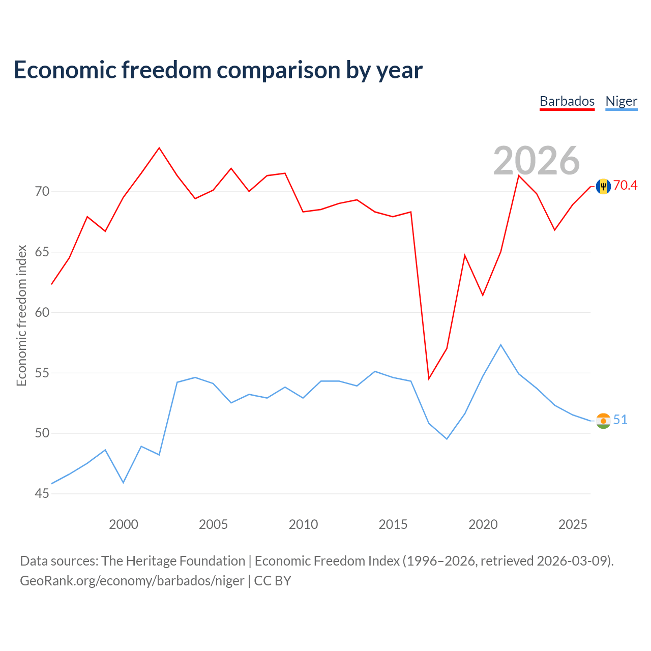 The Economic Freedom Index for Barbados is 70.4, ranking 34/197, compared to 51 for Niger, ranking 156/197. The chart above displays a comparison of annual changes in economic freedom indexes.