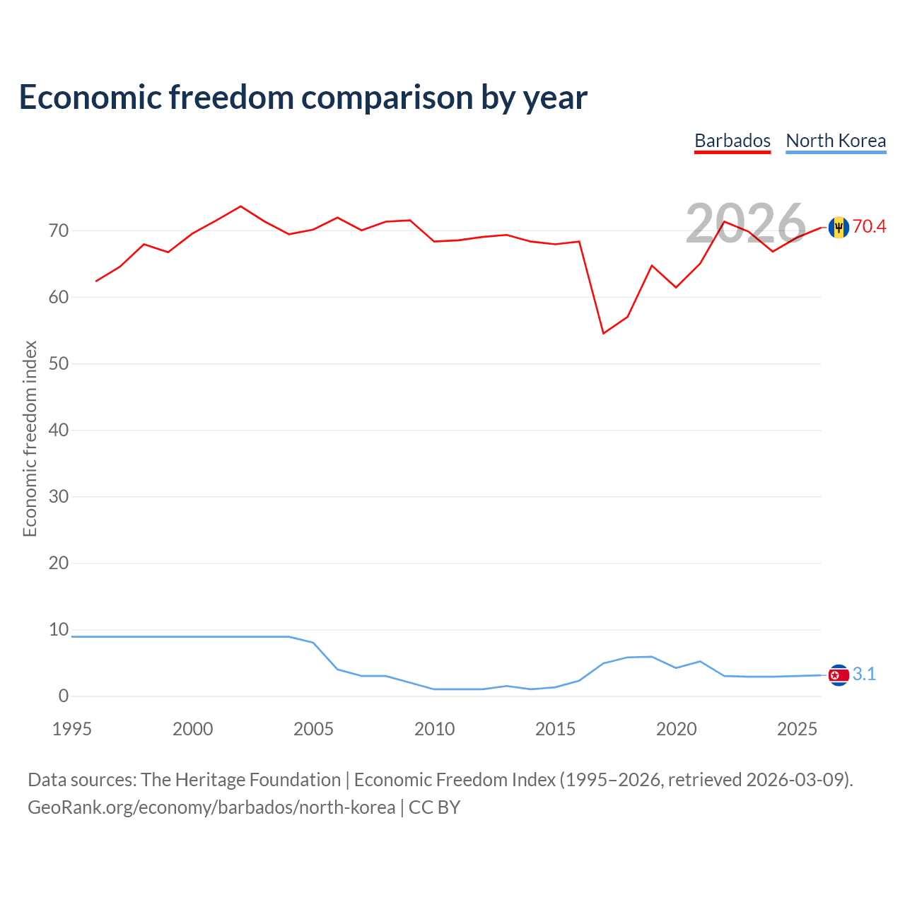 The Economic Freedom Index for Barbados is 70.4, ranking 34/197, compared to 3.1 for North Korea, ranking 197/197. The chart above displays a comparison of annual changes in economic freedom indexes.