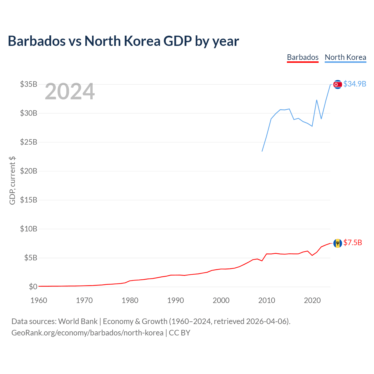 Barbados has a GDP of $7.5B compared to $34.9B for North Korea, ranking 157/197 and 106/197 by economy size, respectively.