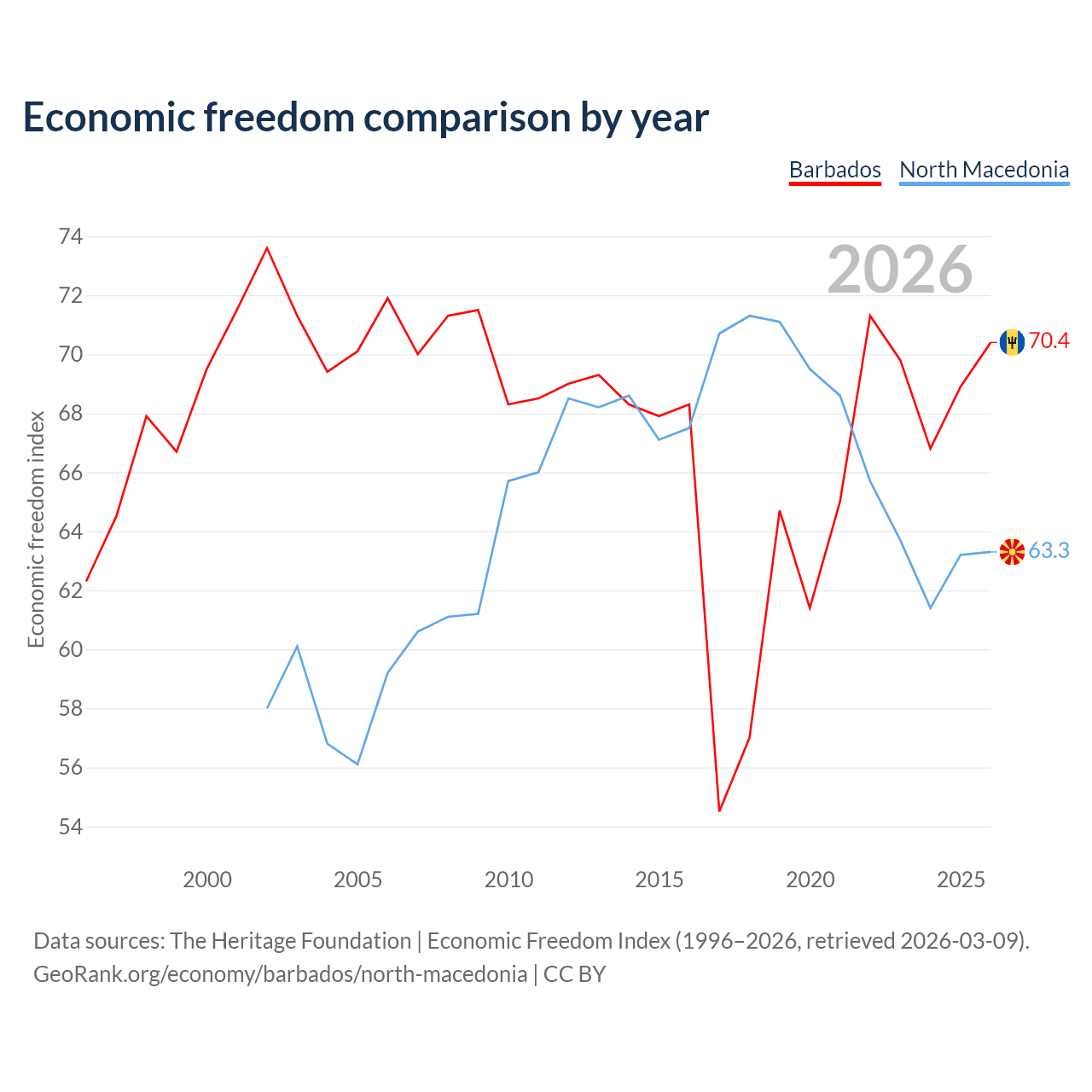 The Economic Freedom Index for Barbados is 70.4, ranking 34/197, compared to 63.3 for North Macedonia, ranking 81/197. The chart above displays a comparison of annual changes in economic freedom indexes.