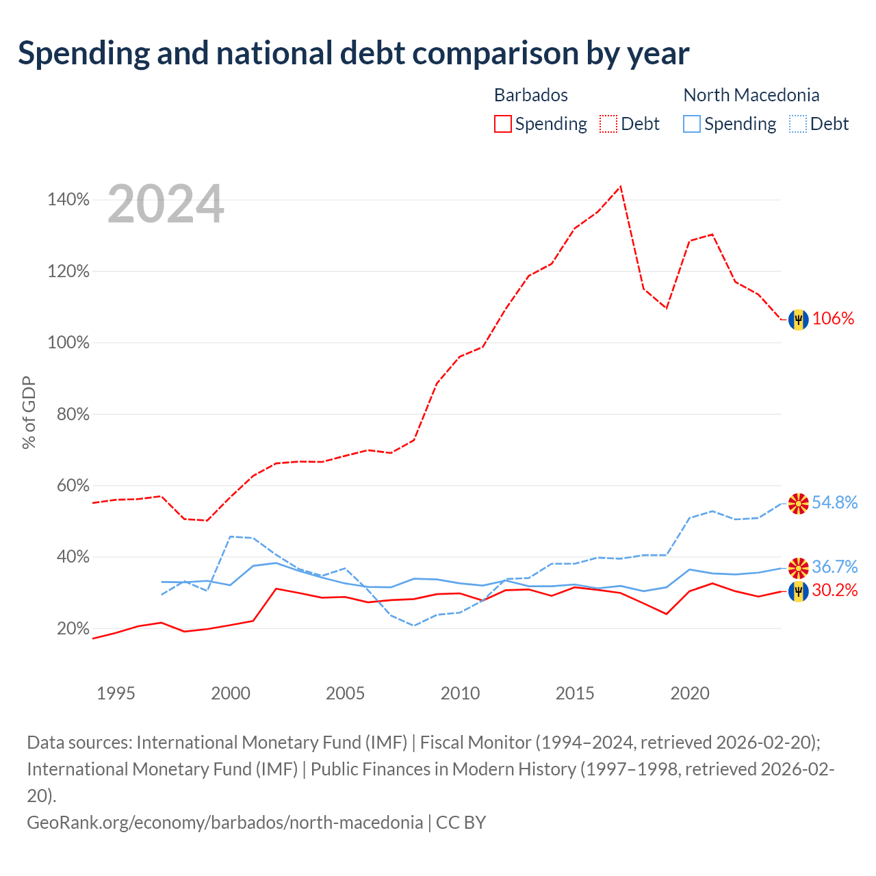 Barbados has $7.97B in government debt (106.3% of GDP), compared to $9.3B (54.8% of GDP) in North Macedonia.