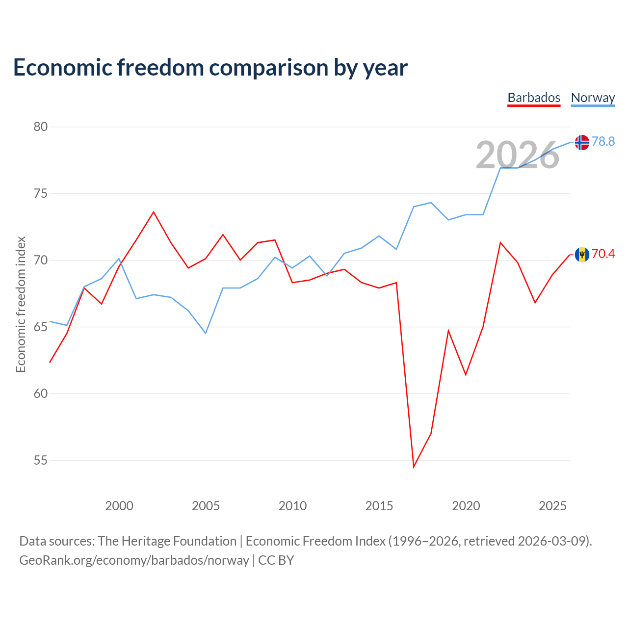 The Economic Freedom Index for Barbados is 70.4, ranking 34/197, compared to 78.8 for Norway, ranking 9/197. The chart above displays a comparison of annual changes in economic freedom indexes.