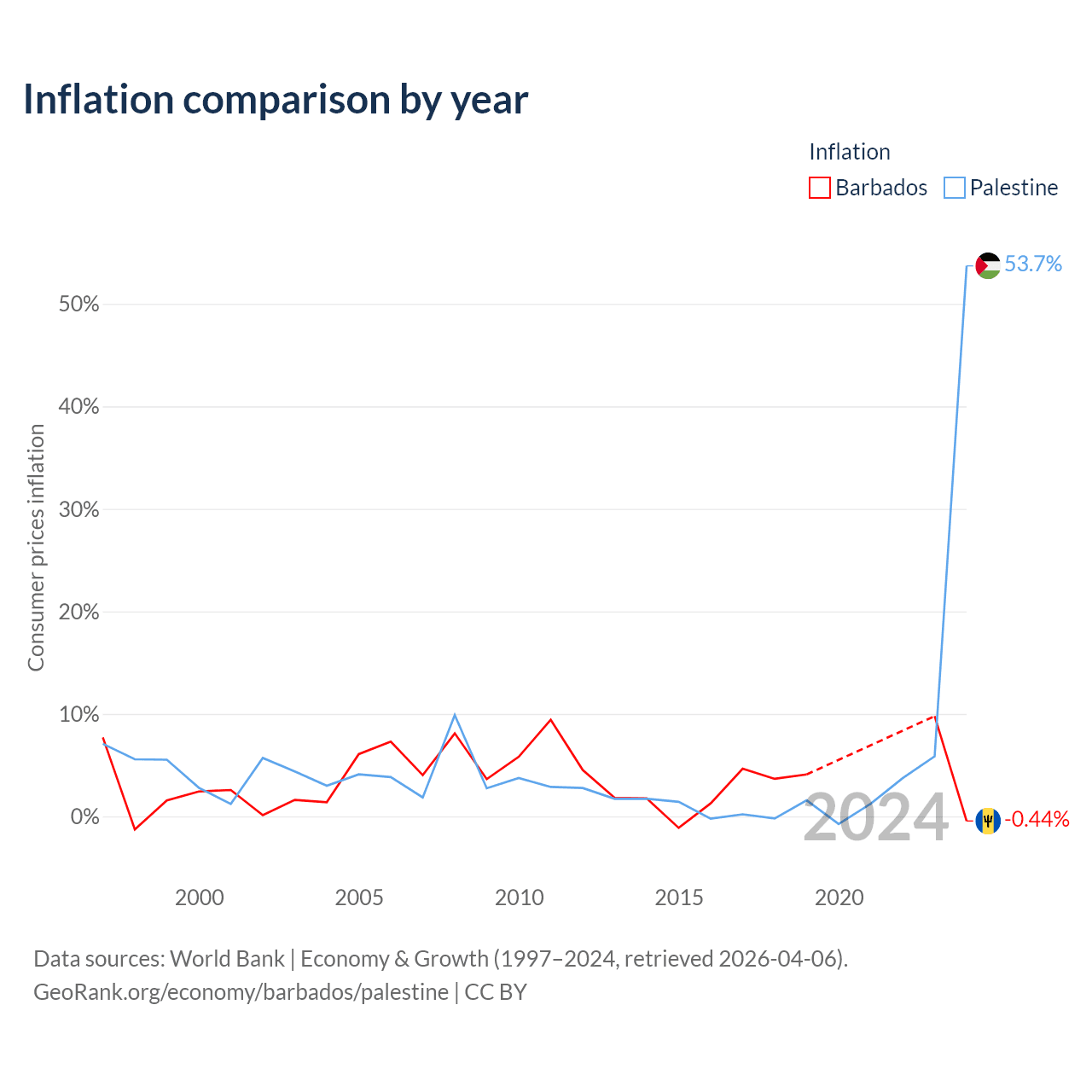 Over the past 28 years, Barbados has recorded an average annual inflation rate of 3.63%, compared with 4.9% in Palestine. In 2024, inflation was -0.44% in Barbados and 53.7% in Palestine.