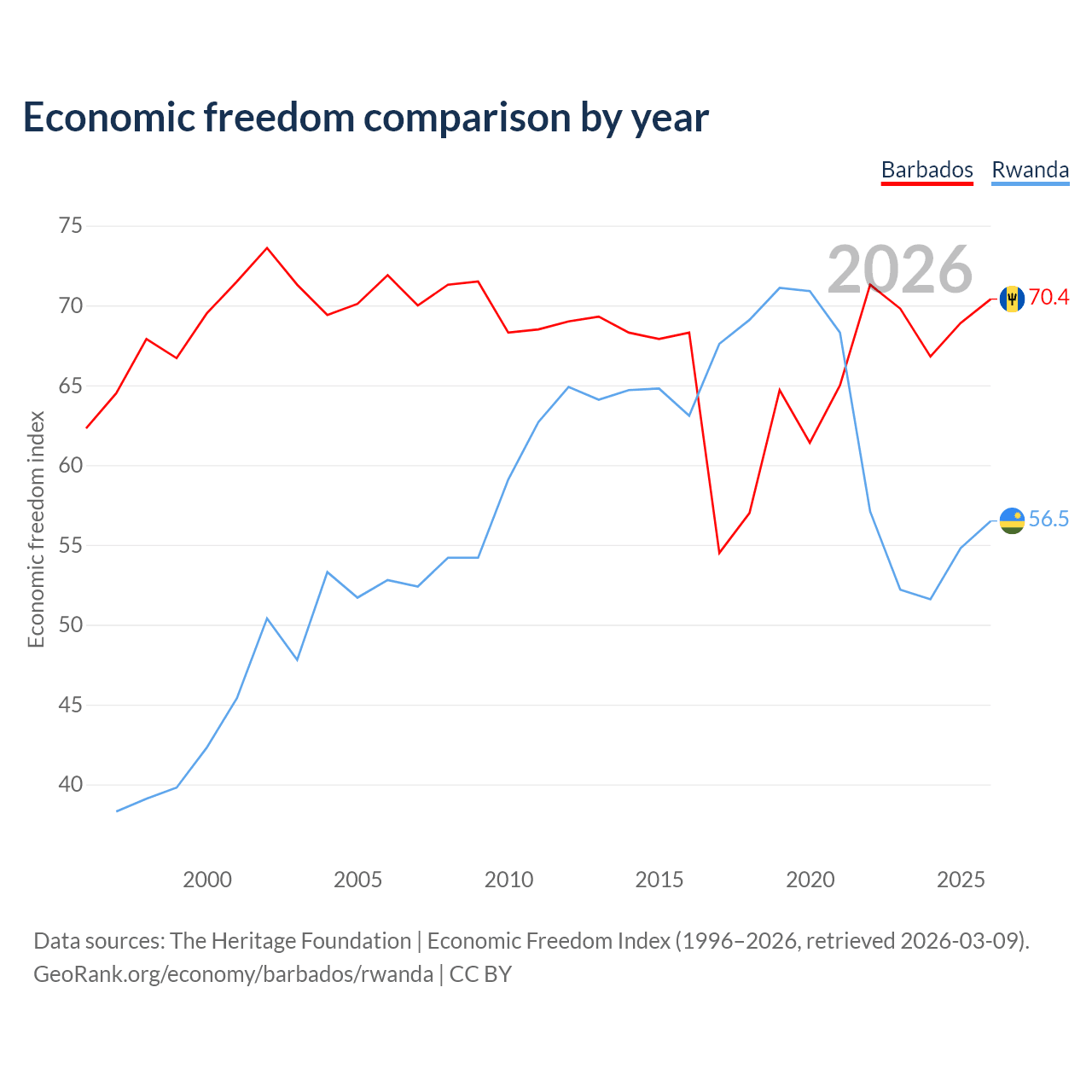 The Economic Freedom Index for Barbados is 70.4, ranking 34/197, compared to 56.5 for Rwanda, ranking 121/197. The chart above displays a comparison of annual changes in economic freedom indexes.