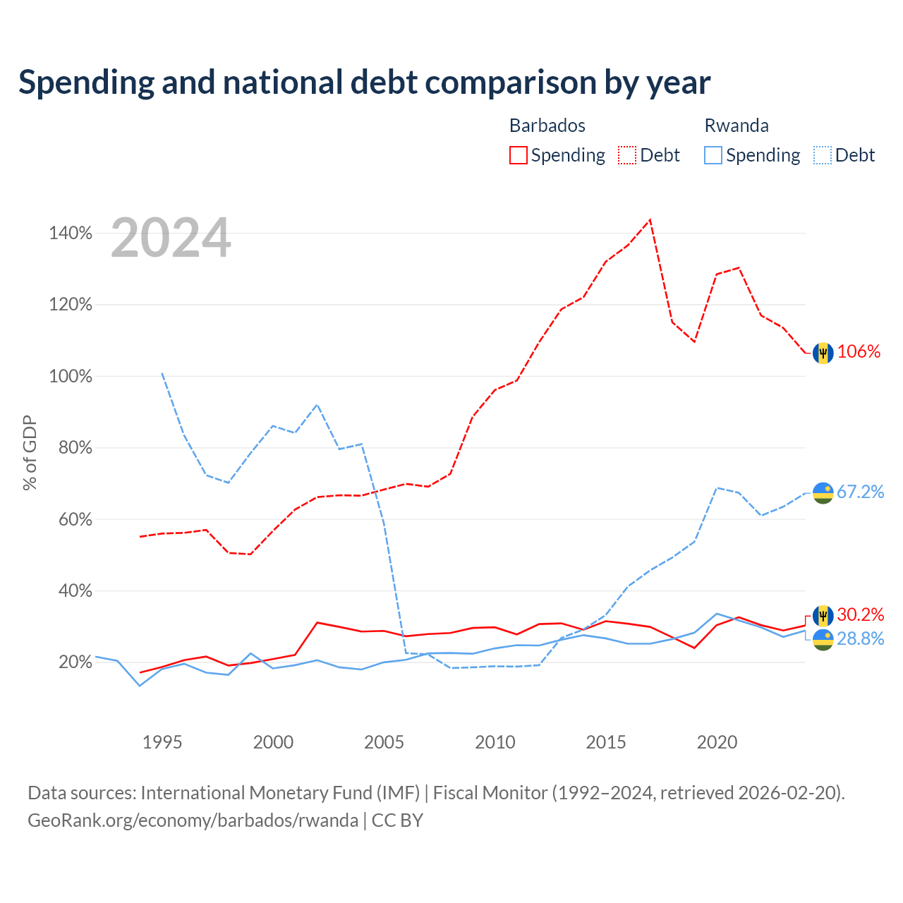 Barbados has $7.97B in government debt (106.3% of GDP), compared to $9.58B (67.2% of GDP) in Rwanda.