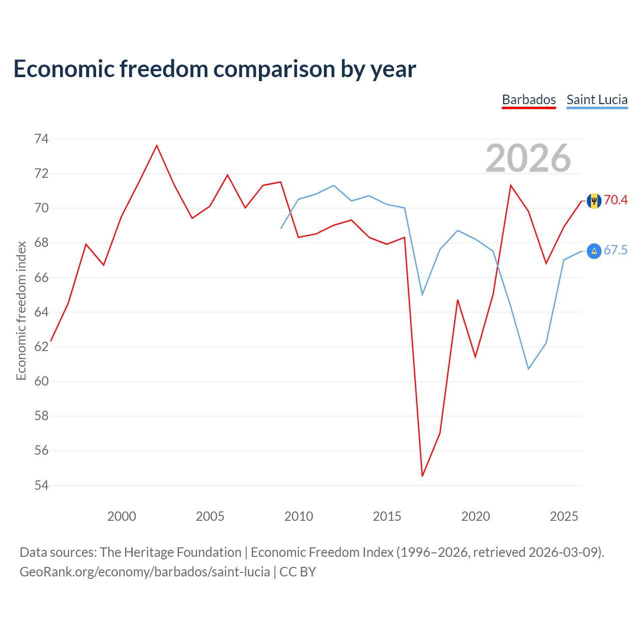 The Economic Freedom Index for Barbados is 70.4, ranking 34/197, compared to 67.5 for Saint Lucia, ranking 57/197. The chart above displays a comparison of annual changes in economic freedom indexes.