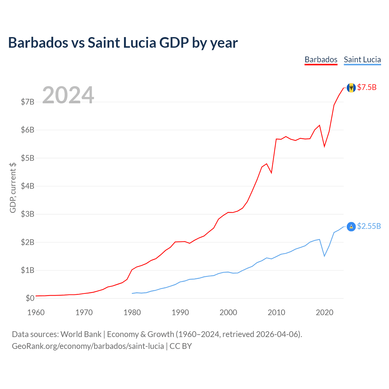 Barbados has a GDP of $7.5B compared to $2.55B for Saint Lucia, ranking 157/197 and 173/197 by economy size, respectively.