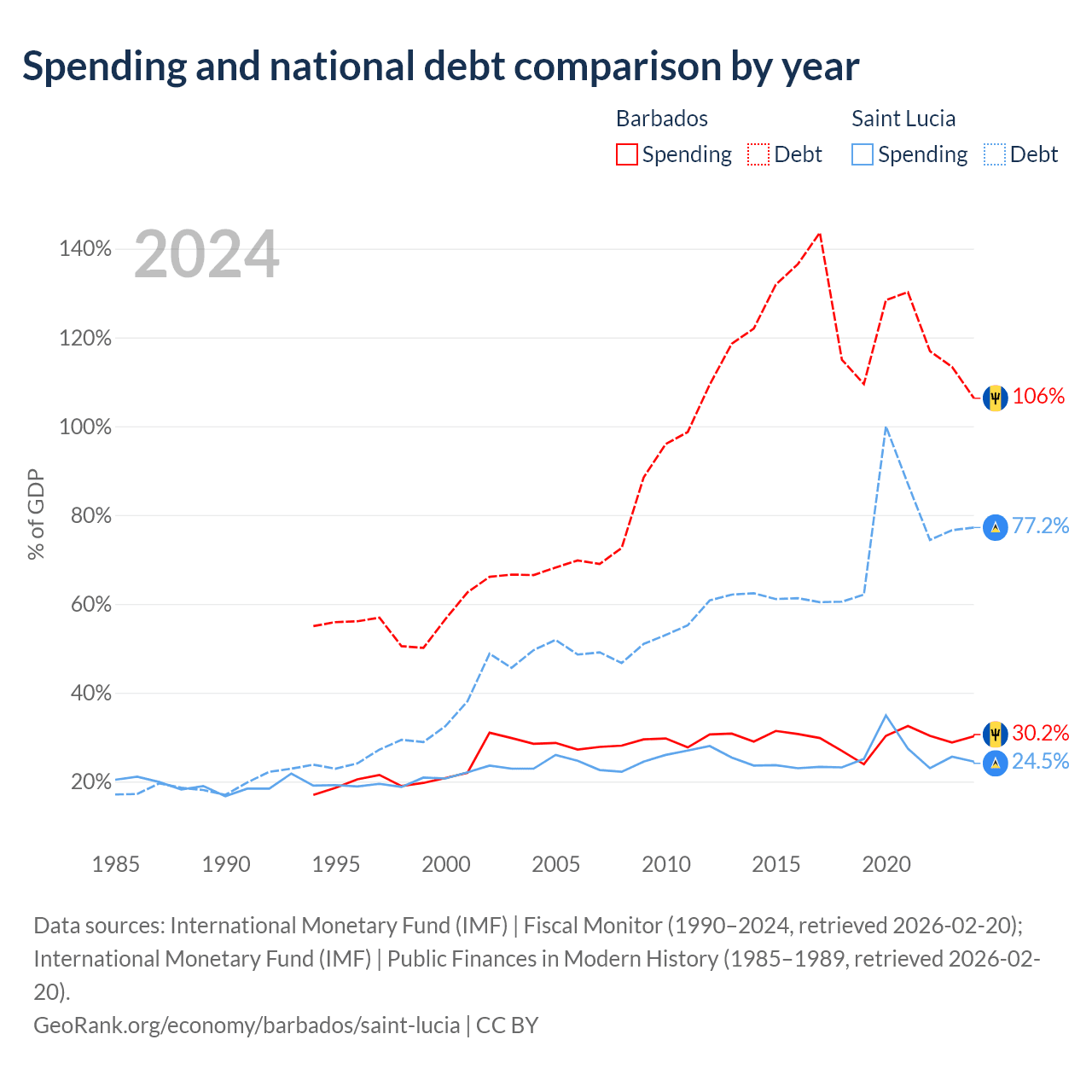 Barbados has $7.97B in government debt (106.3% of GDP), compared to $1.97B (77.2% of GDP) in Saint Lucia.