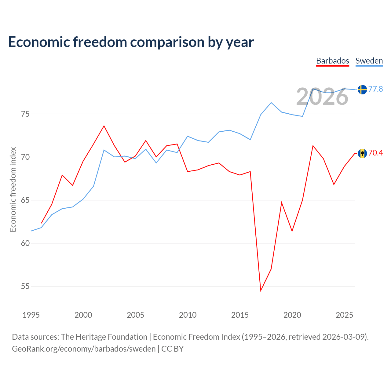 The Economic Freedom Index for Barbados is 70.4, ranking 34/197, compared to 77.8 for Sweden, ranking 14/197. The chart above displays a comparison of annual changes in economic freedom indexes.