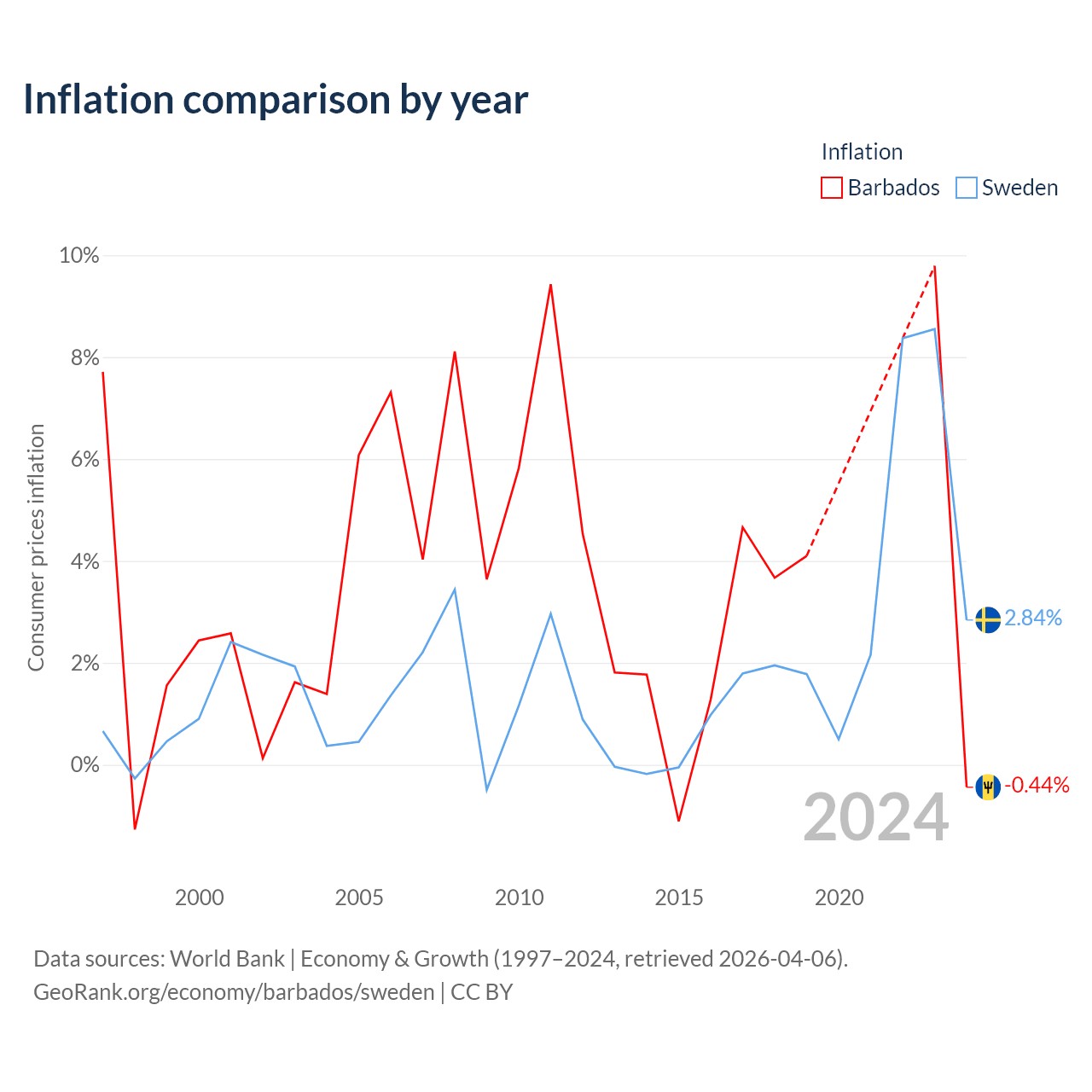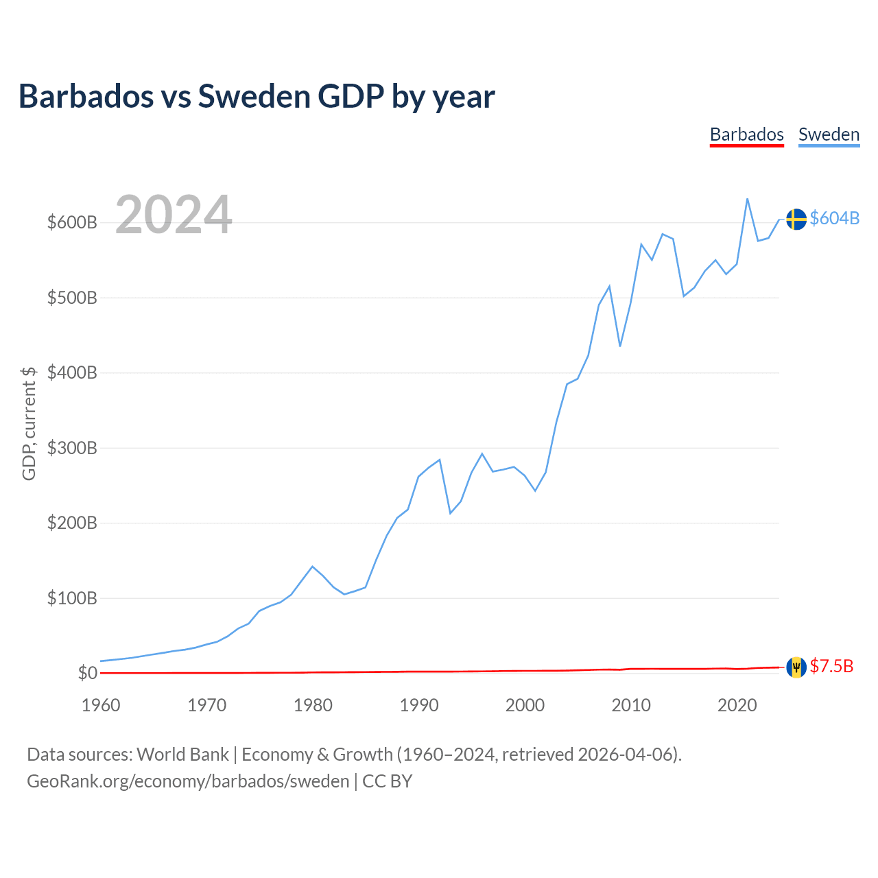 Barbados has a GDP of $7.5B compared to $604B for Sweden, ranking 157/197 and 26/197 by economy size, respectively.