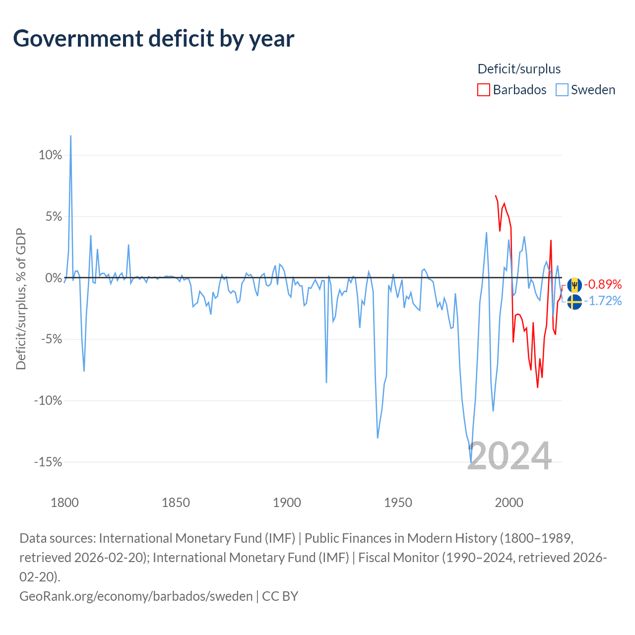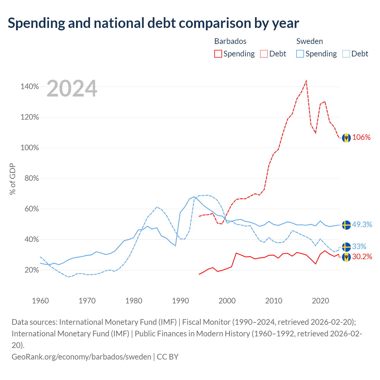 Barbados has $7.97B in government debt (106.3% of GDP), compared to $199B (33% of GDP) in Sweden.