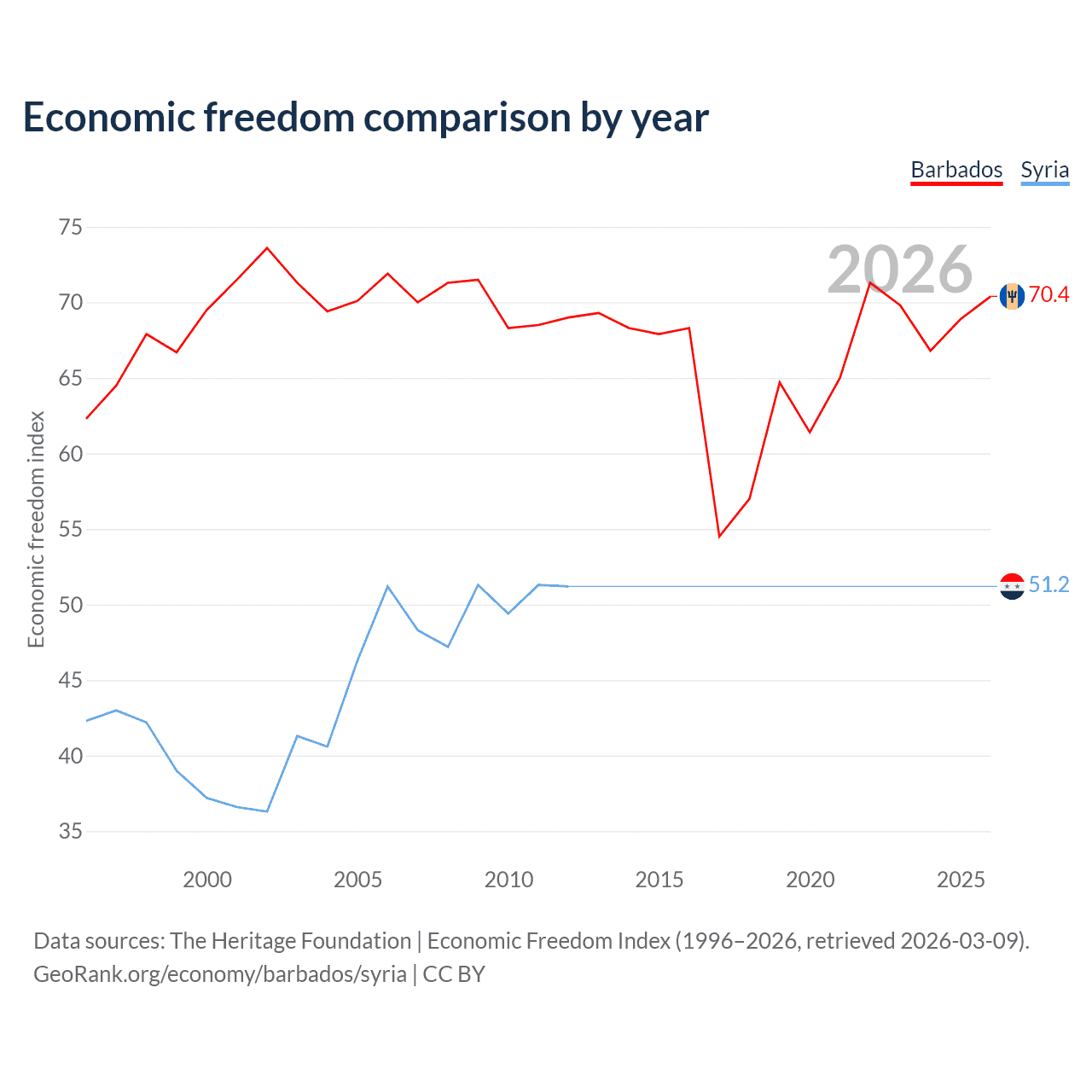 The Economic Freedom Index for Barbados is 70.4, ranking 34/197, compared to 51.2 for Syria, ranking 155/197. The chart above displays a comparison of annual changes in economic freedom indexes.