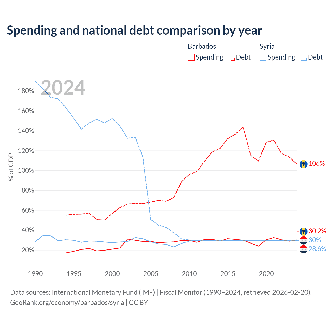 Barbados has $7.97B in government debt (106.3% of GDP), compared to $18.4B (30% of GDP) in Syria.
