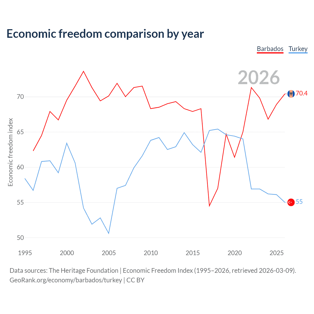 The Economic Freedom Index for Barbados is 70.4, ranking 34/197, compared to 55 for Turkey, ranking 129/197. The chart above displays a comparison of annual changes in economic freedom indexes.