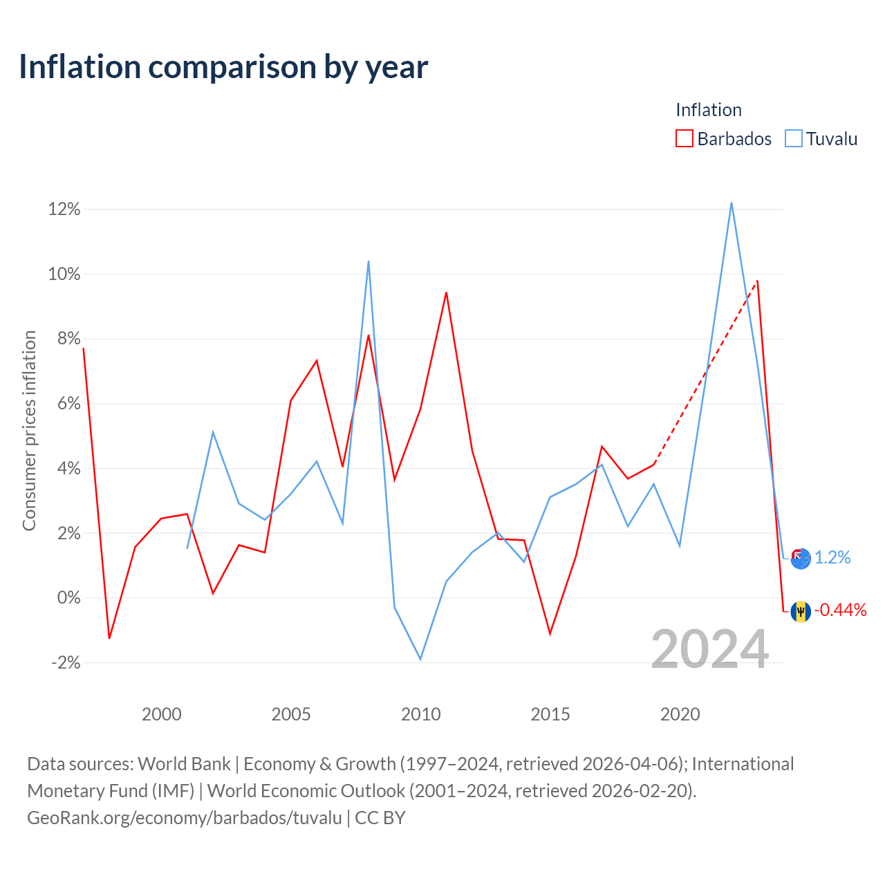 Over the past 24 years, Barbados has recorded an average annual inflation rate of 3.82%, compared with 3.34% in Tuvalu. In 2024, inflation was -0.44% in Barbados and 1.2% in Tuvalu.