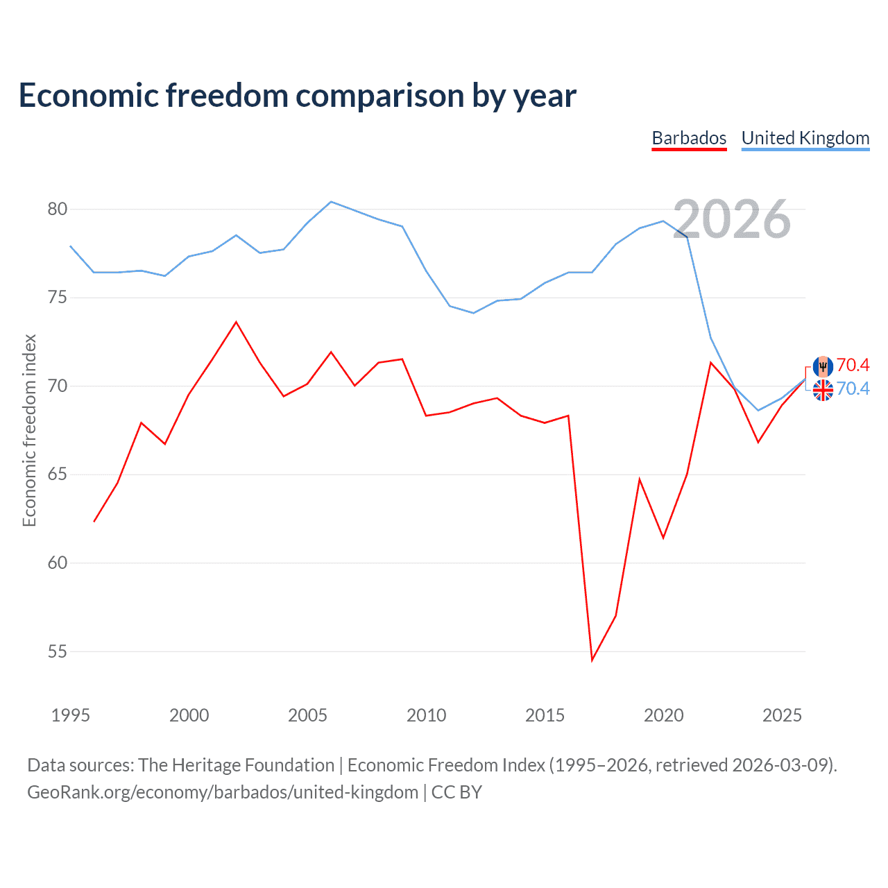 The Economic Freedom Index for Barbados is 70.4, ranking 34/197, compared to 70.4 for the United Kingdom, ranking 35/197. The chart above displays a comparison of annual changes in economic freedom indexes.