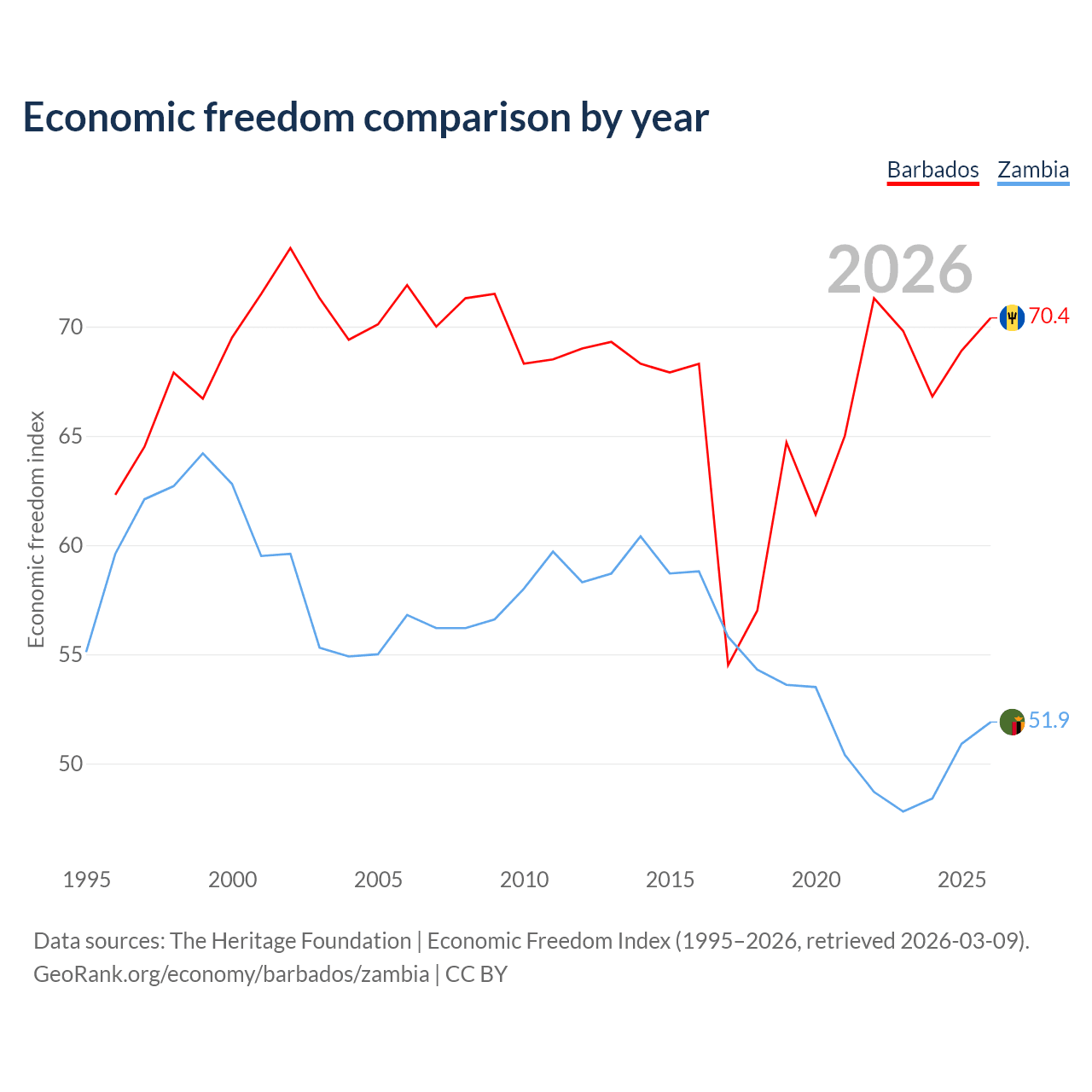 The Economic Freedom Index for Barbados is 70.4, ranking 34/197, compared to 51.9 for Zambia, ranking 152/197. The chart above displays a comparison of annual changes in economic freedom indexes.