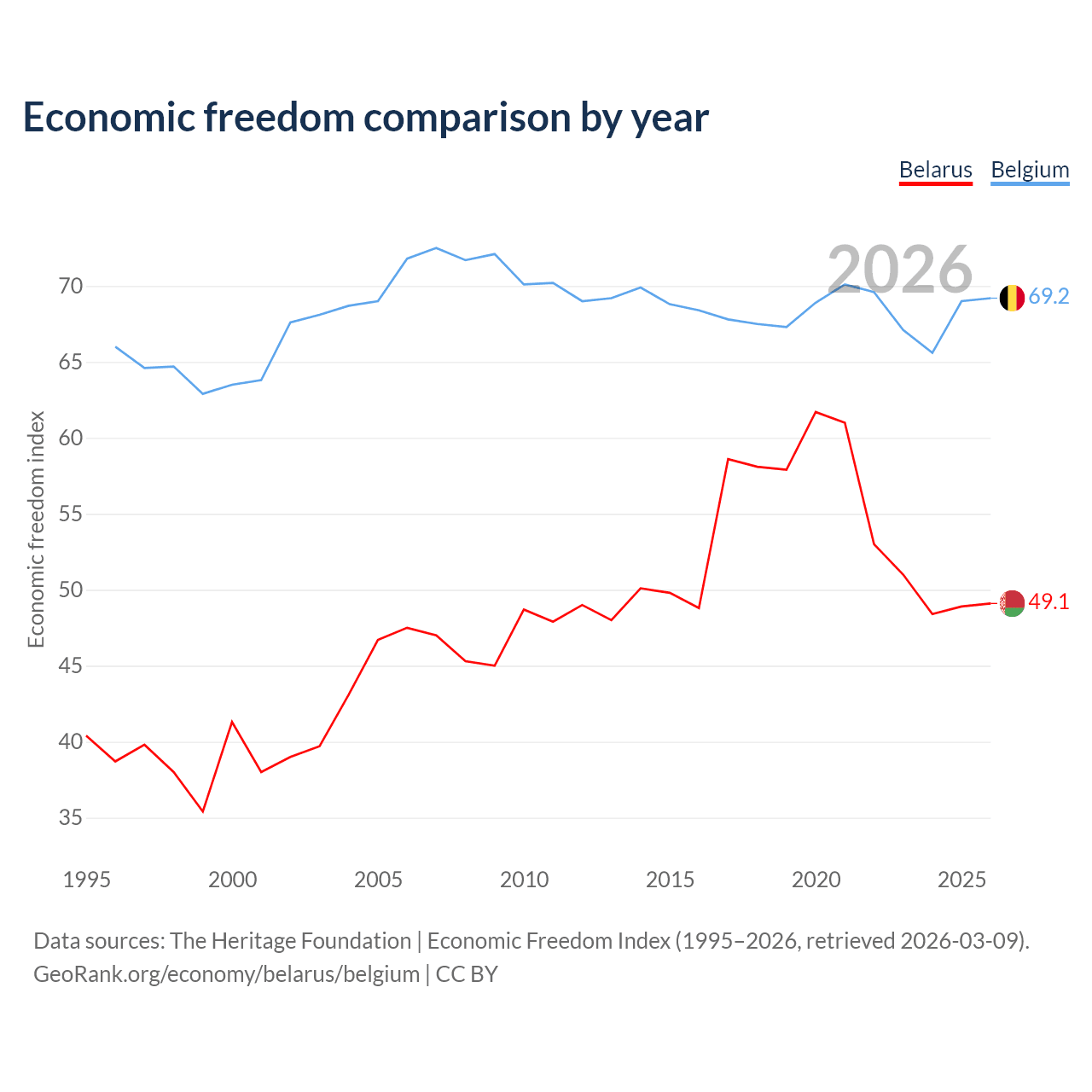 The Economic Freedom Index for Belarus is 49.1, ranking 166/197, compared to 69.2 for Belgium, ranking 42/197. The chart above displays a comparison of annual changes in economic freedom indexes.