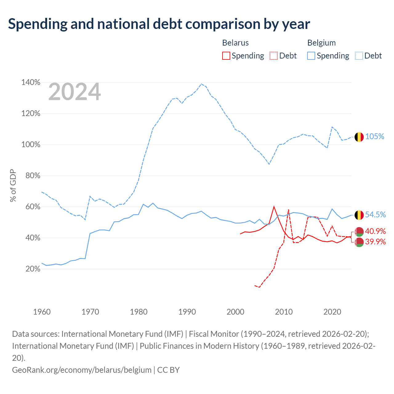 Belarus has $30.3B in government debt (39.9% of GDP), compared to $703B (104.7% of GDP) in Belgium.