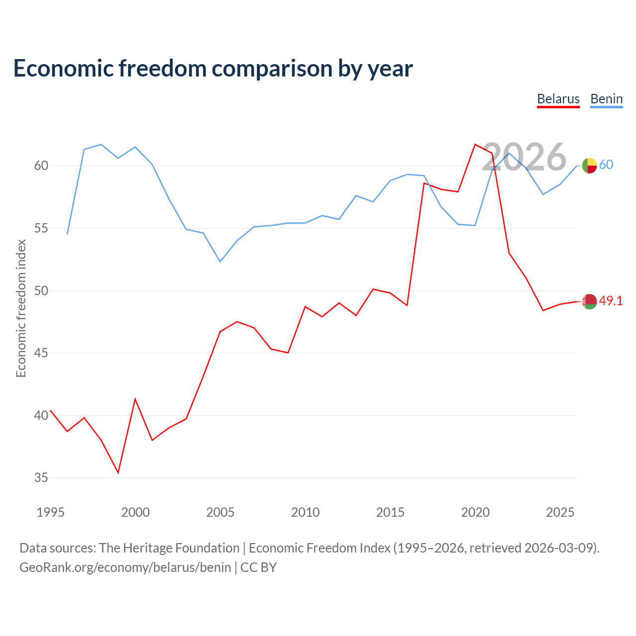 The Economic Freedom Index for Belarus is 49.1, ranking 166/197, compared to 60 for Benin, ranking 96/197. The chart above displays a comparison of annual changes in economic freedom indexes.