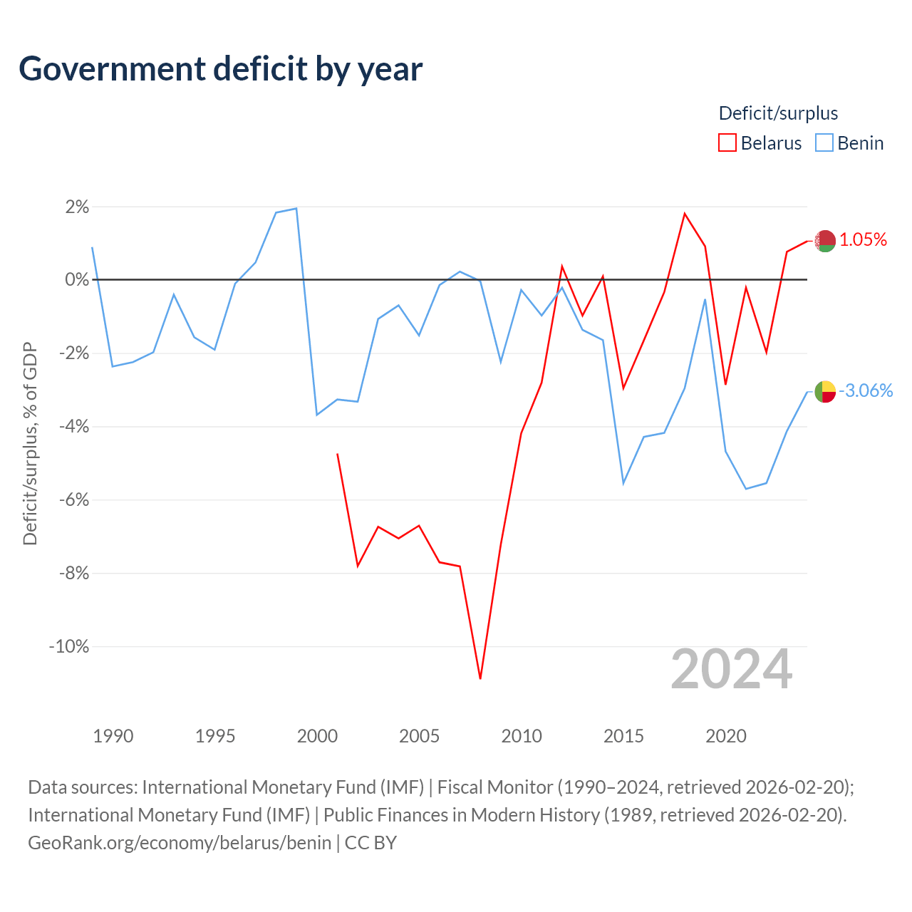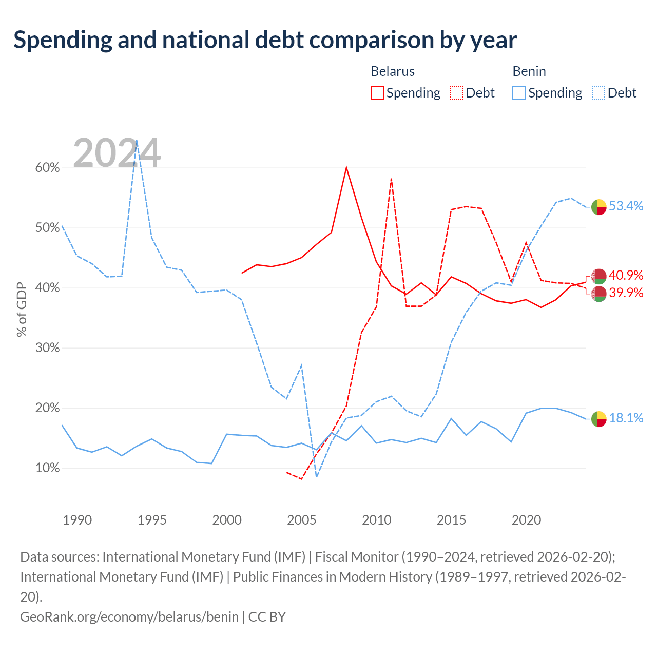 Belarus has $30.3B in government debt (39.9% of GDP), compared to $11.5B (53.4% of GDP) in Benin.