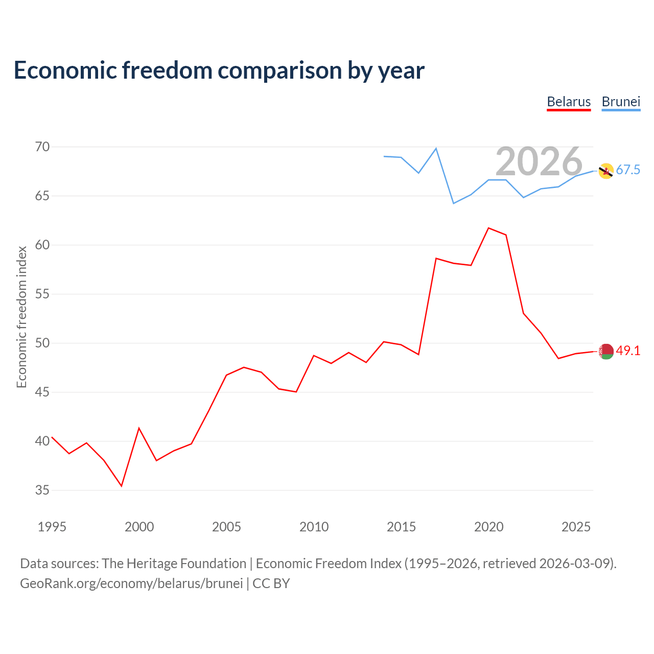 The Economic Freedom Index for Belarus is 49.1, ranking 166/197, compared to 67.5 for Brunei, ranking 55/197. The chart above displays a comparison of annual changes in economic freedom indexes.