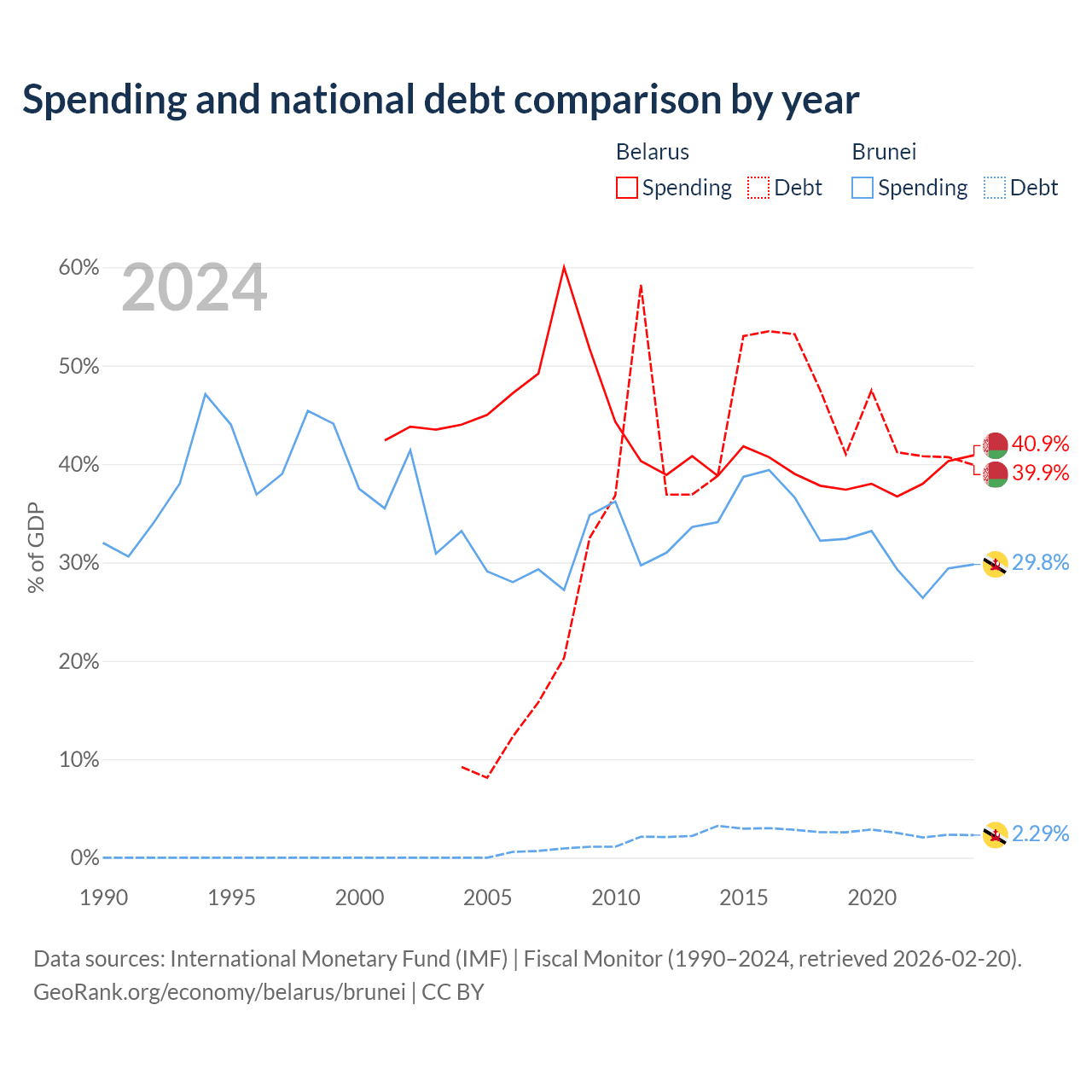 Belarus has $30.3B in government debt (39.9% of GDP), compared to $351M (2.29% of GDP) in Brunei.