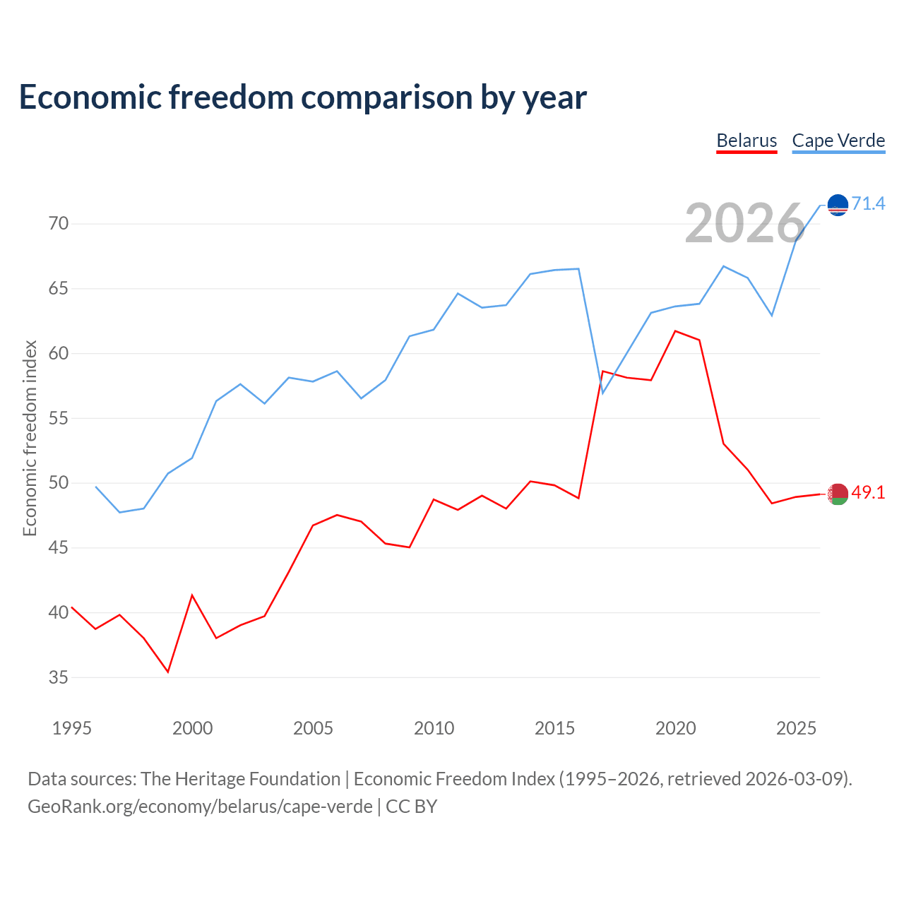 The Economic Freedom Index for Belarus is 49.1, ranking 166/197, compared to 71.4 for Cape Verde, ranking 32/197. The chart above displays a comparison of annual changes in economic freedom indexes.