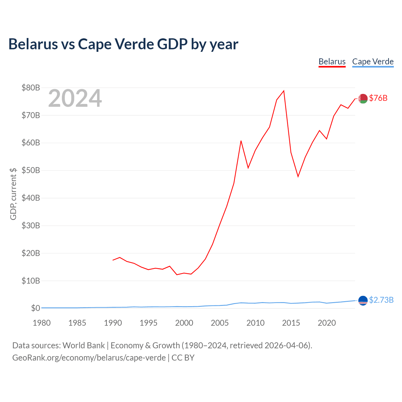 Belarus has a GDP of $76B compared to $2.73B for Cape Verde, ranking 83/197 and 172/197 by economy size, respectively.
