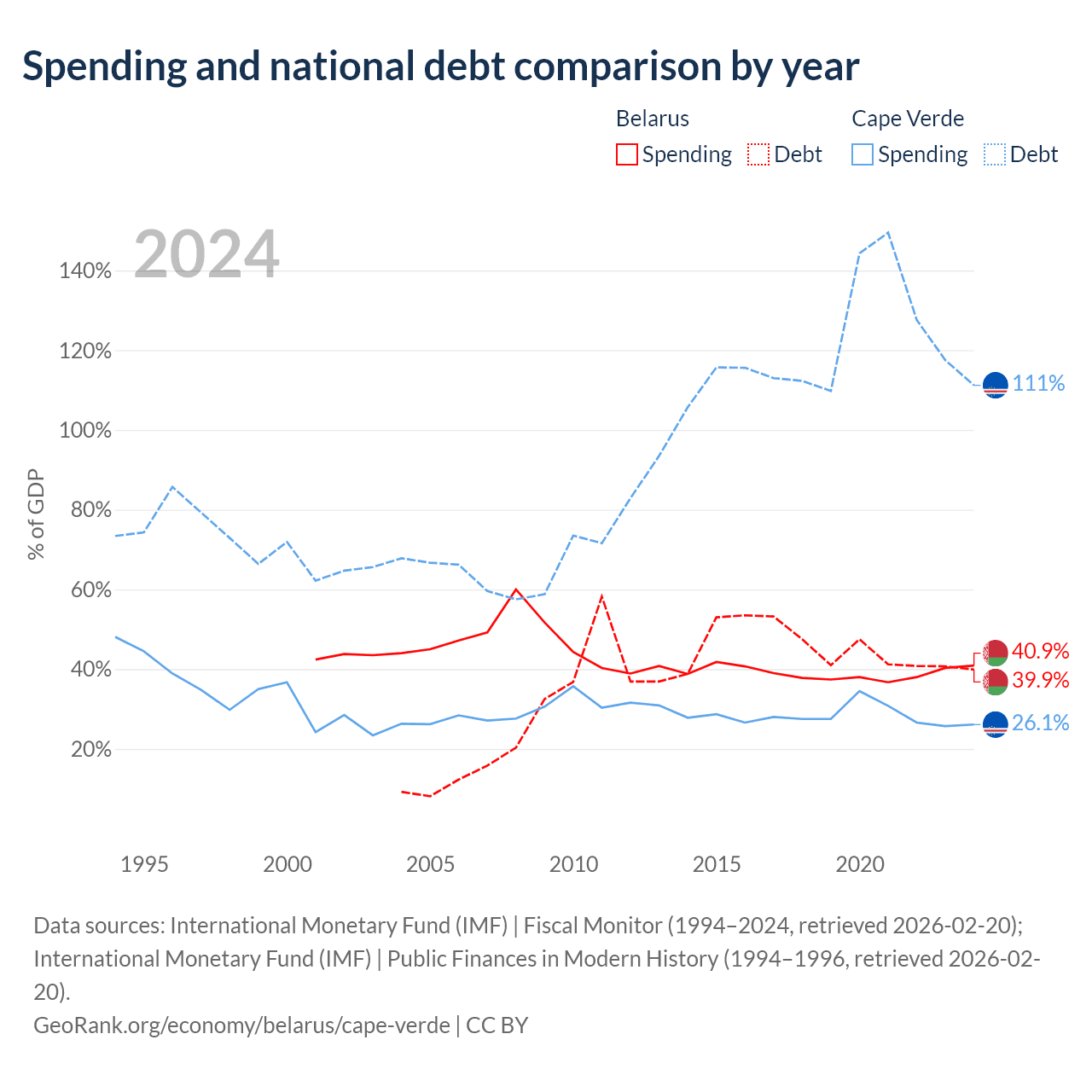 Belarus has $30.3B in government debt (39.9% of GDP), compared to $3.03B (111.2% of GDP) in Cape Verde.