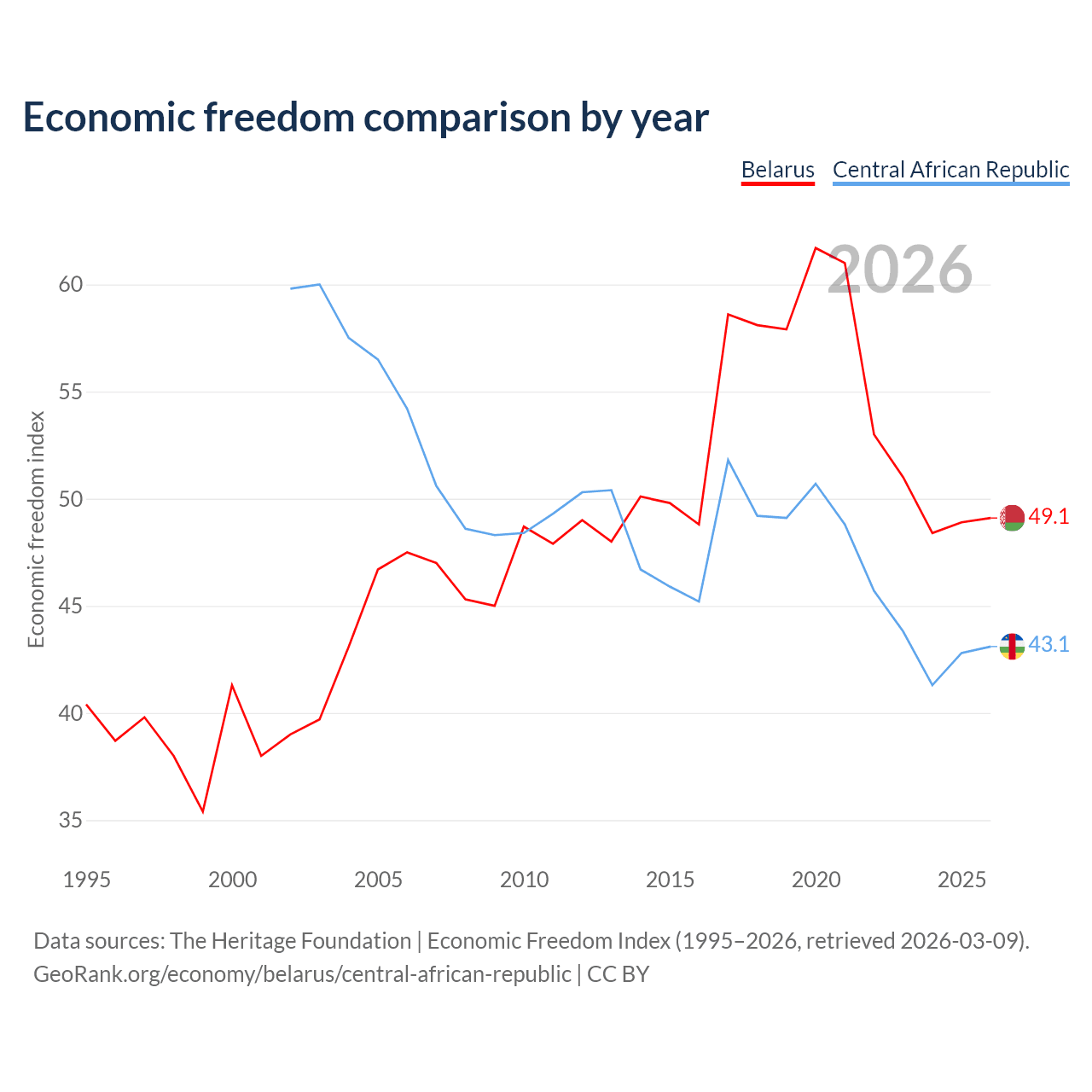 The Economic Freedom Index for Belarus is 49.1, ranking 166/197, compared to 43.1 for the Central African Republic, ranking 182/197. The chart above displays a comparison of annual changes in economic freedom indexes.